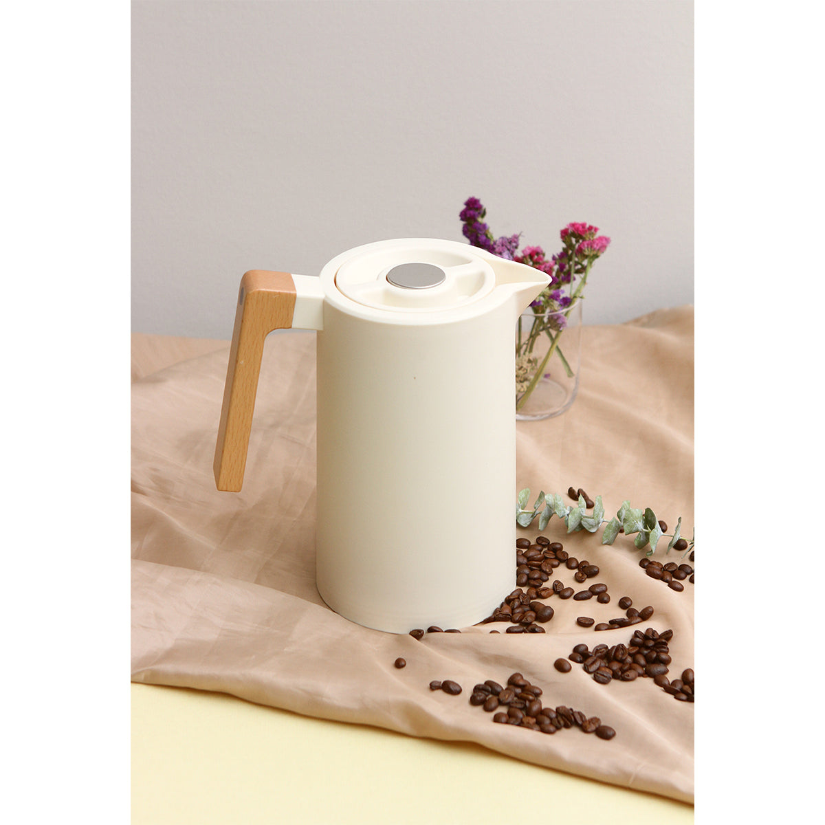 jarra para agua fabricada en acero inoxidable de doble pared, cubierta de plástico. cuenta con tapa, asa y boquilla para servir sin derramar. capacidad de 1 litro.