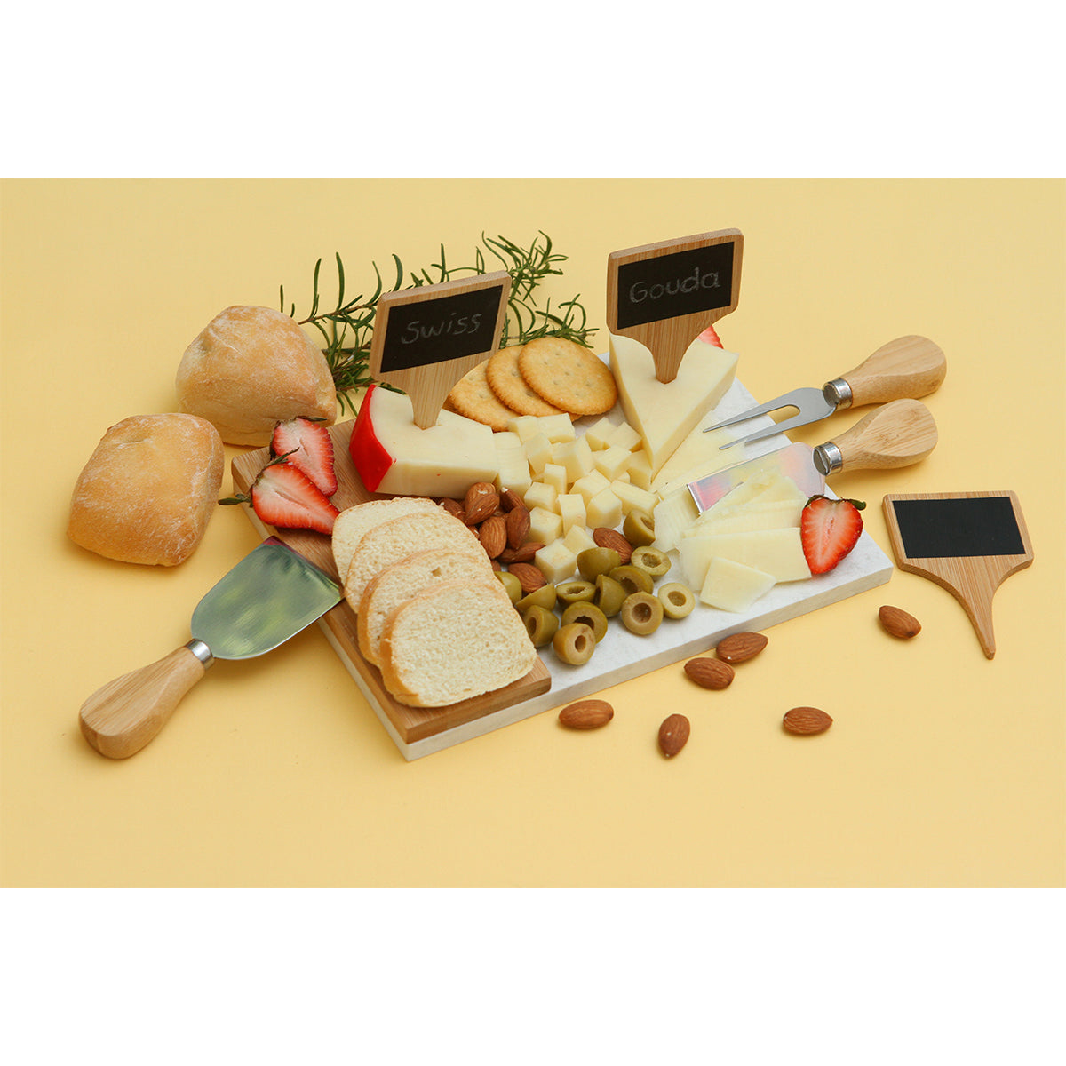 set de quesos fabricado en mármol y madera de bambú. incluye 3 marcadores de madera y 3 utensilios de acero inoxidable, especiales para quesos. su diseño en mármol le otorga un perfil elegante, que lo hace la opción indicada para reuniones. un set práctico y sofisticado que facilita la presentación en reuniones y añade un toque gourmet a cualquier ocasión.