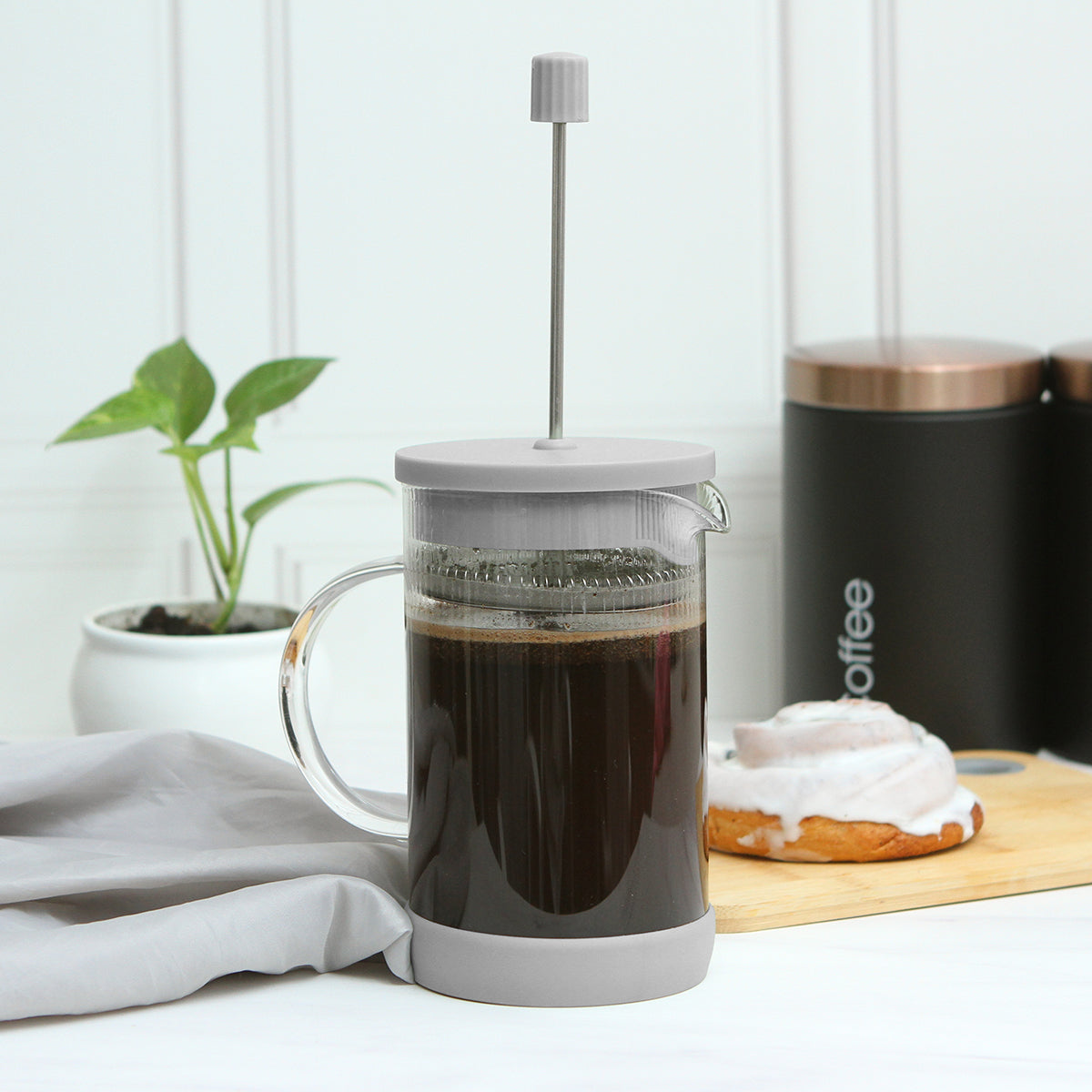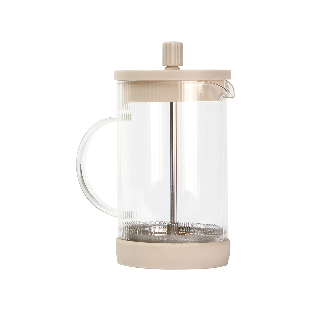 prensa francesa de 800 ml, cuerpo fabricado en vidrio de borosilicato y acero inoxidable con tapa fabricada en polipropileno. la parte de abajo está fabricada en plástico tipo tpr característico por su flexibilidad, durabilidad, además, es removible para fácil limpieza.