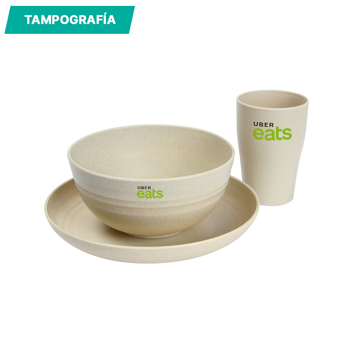 set de 12 piezas de vajilla elegante, ecológico y funcional. este set incluye 4 platos, 4 bowls y 4 vasos fabricados con una mezcla sostenible de paja de trigo y polipropileno. ligero, reutilizable, libre de bpa. perfecto para el uso diario con un diseño minimalista en tono beige natural.