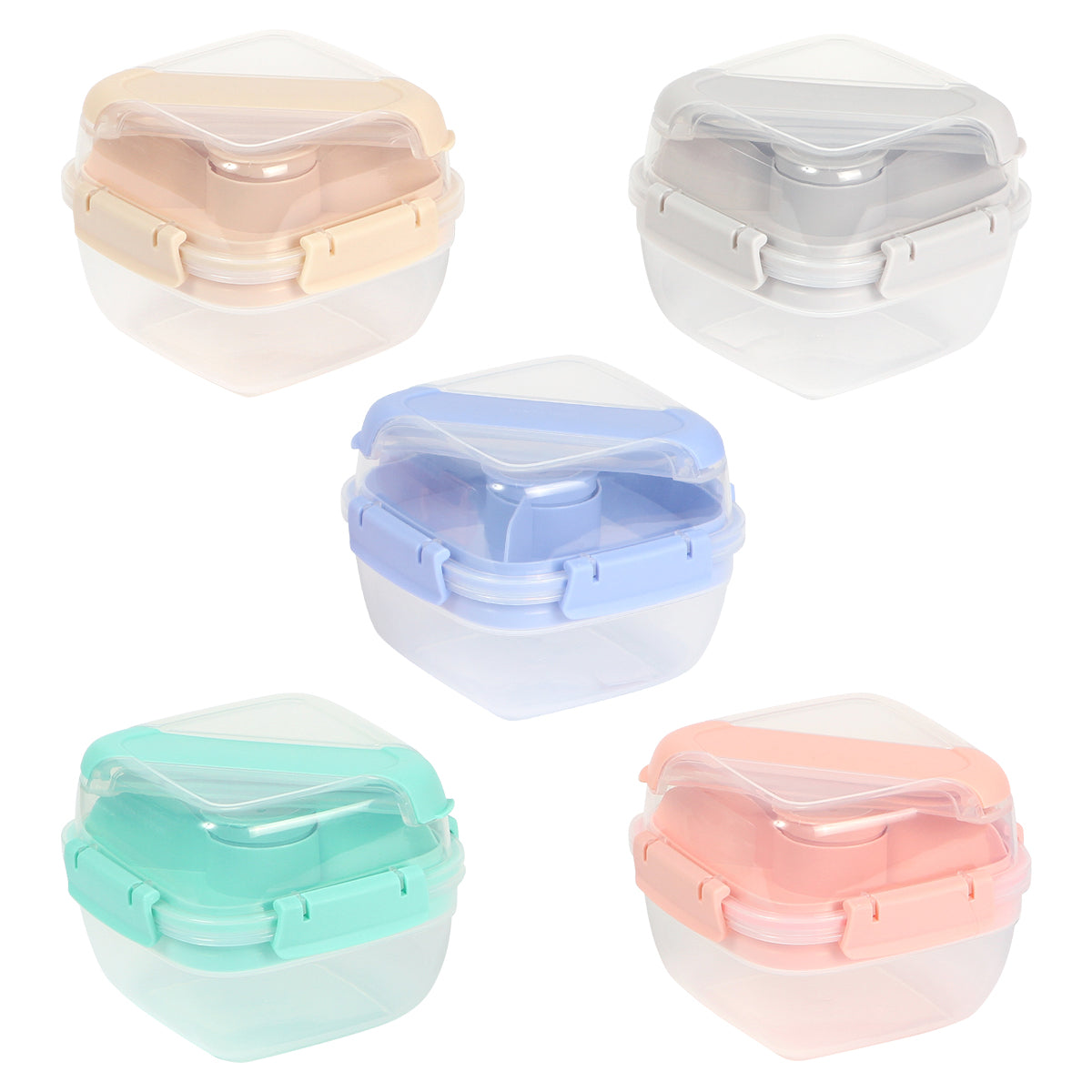contenedor de alimentos hermético fabricado en polipropileno y silicón. es resistente e ideal para mantener tus comidas frescas y seguras. con diseño compacto y práctico, es perfecto para llevar al trabajo o escuela. incluye una cuchara, un tenedor, un cuchillo, un contenedor de alimentos con tapa con divisores y un contenedor pequeño tipo salsero.