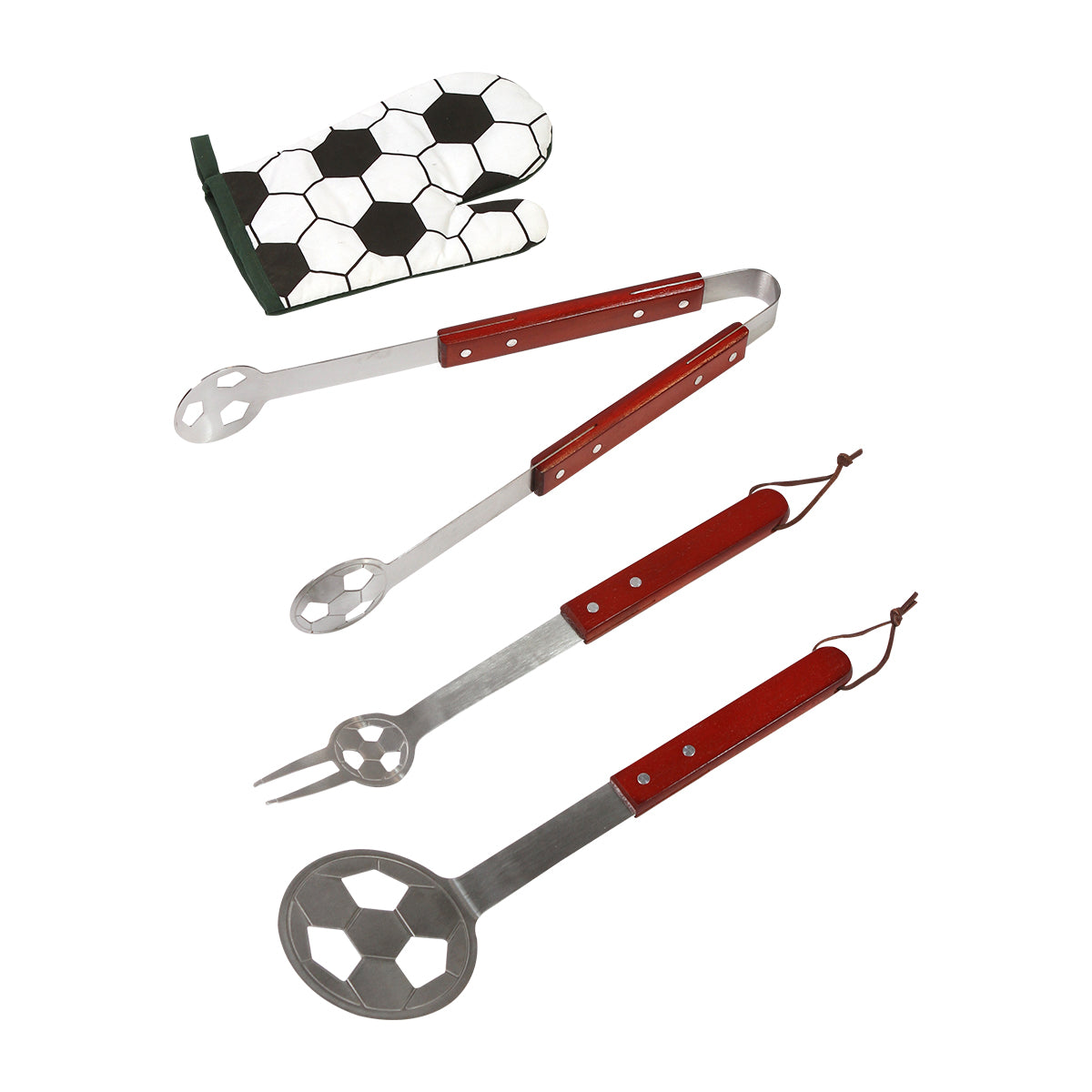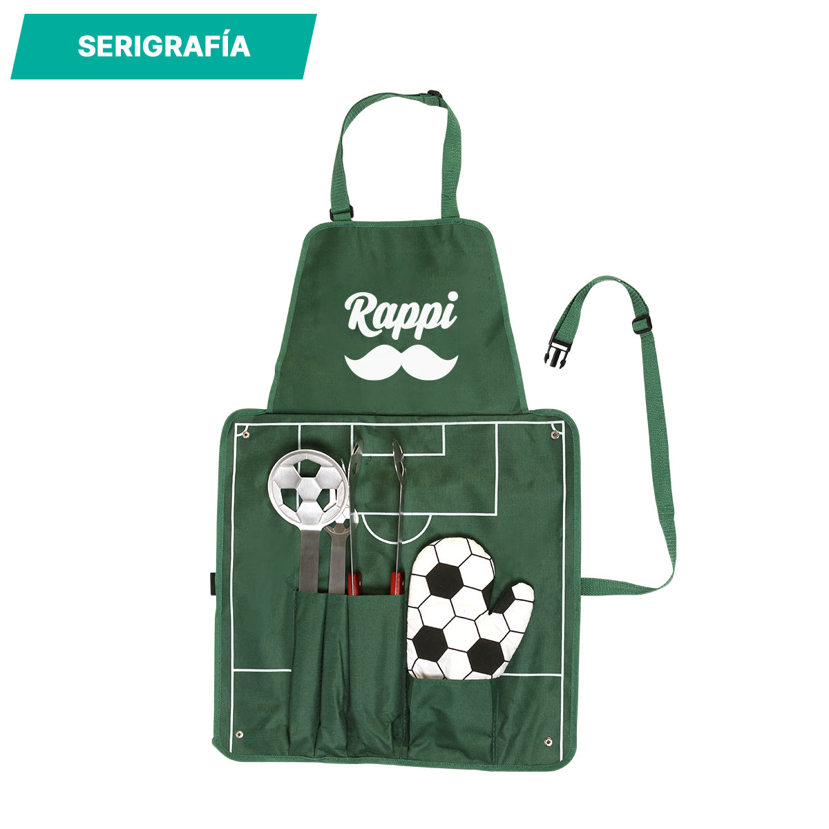 lleva tus asados al siguiente nivel con este completo juego de bbq diseñado para los amantes de la parrilla. fabricado con herramientas de acero inoxidable de alta calidad, que garantizan resistencia, durabilidad y fácil limpieza, y un mandil de poliéster con un diseño de cancha de fútbol que no pasará desapercibido, cómodo y práctico para proteger tu ropa mientras cocinas. además, cuenta con bolsillos para guardar y transportar las herramientas de forma práctica y segura. el set incluye todo lo necesario para una experiencia de parrilla profesional y organizada: un tenedor, una espátula, una manopla resistente y pinzas, cada uno pensado para facilitar el manejo y control de tus alimentos. ideal para asados en casa, picnics, campamentos o regalos especiales. disfruta de una experiencia de barbacoa completa y sin complicaciones con este set profesional que combina calidad, funcionalidad y estilo. combina tu amor por la parrilla y el fútbol. ¡haz de cada asado una celebración!