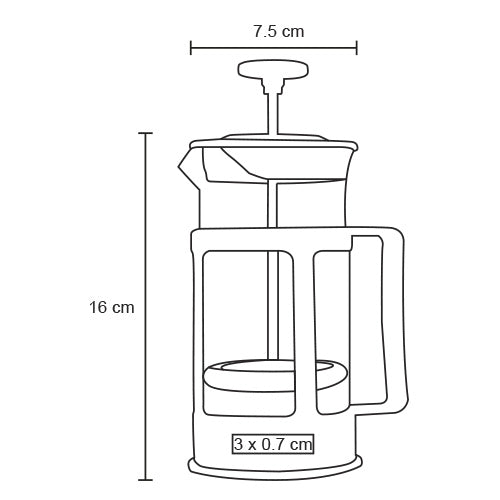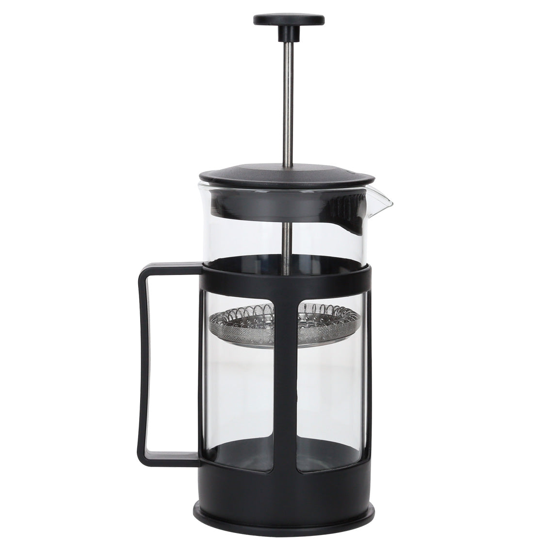 cafetera de cristal tipo francés con base y tapa de plástico, filtro de acero inoxidable.