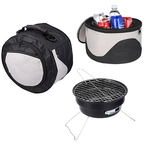 asador portátil de acero inoxidable. incluye rejilla cromada y estuche de transporte que se convierte en una práctica hielera.