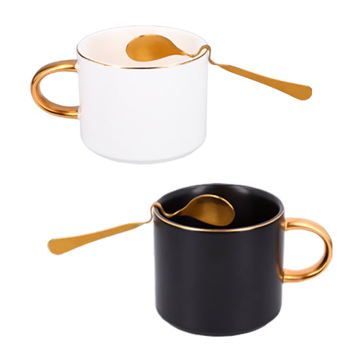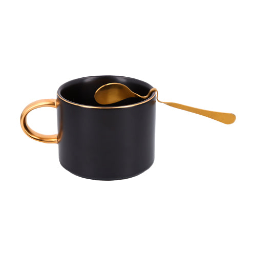 taza de cerámica con cuchara de acero inoxidable para sujeción en el borde.