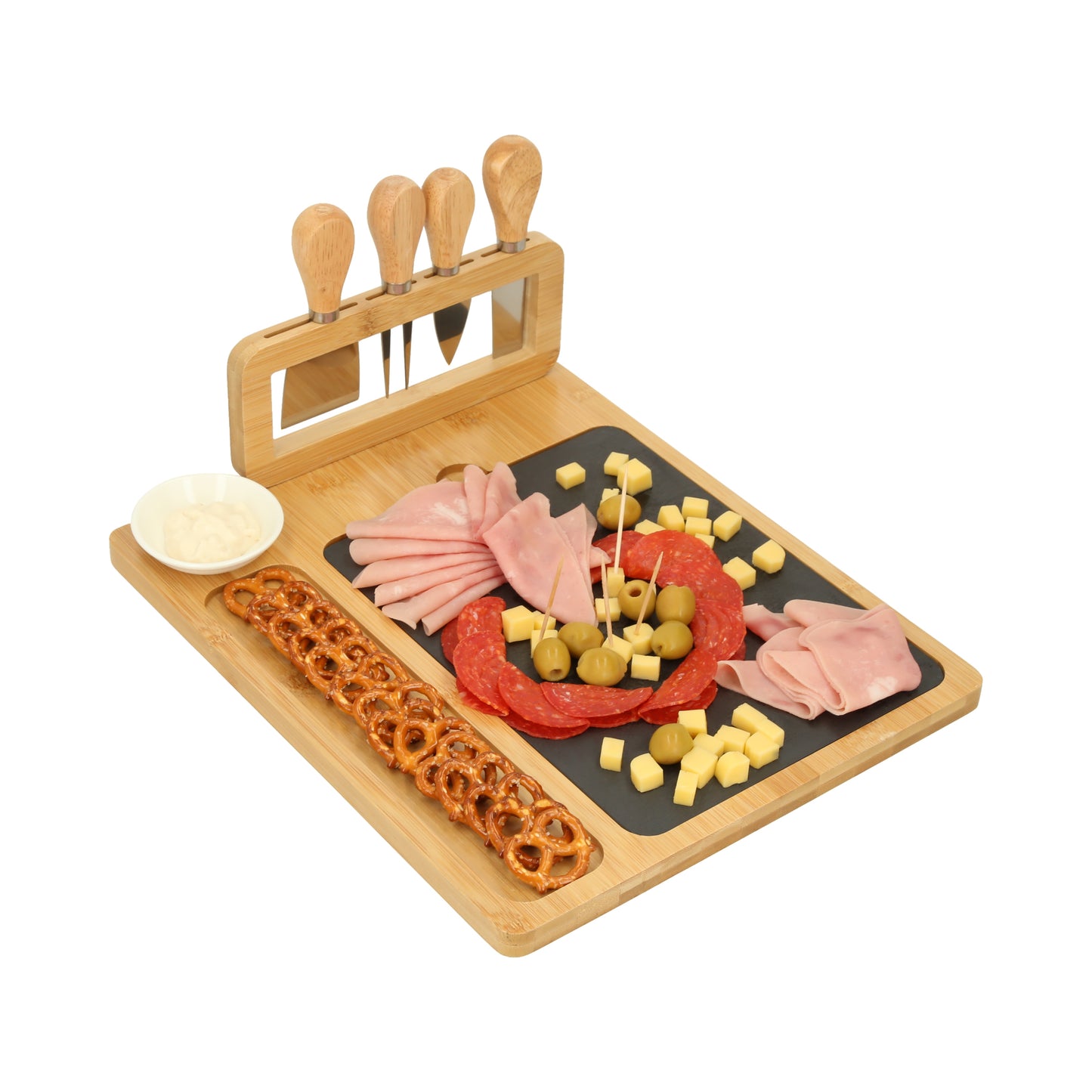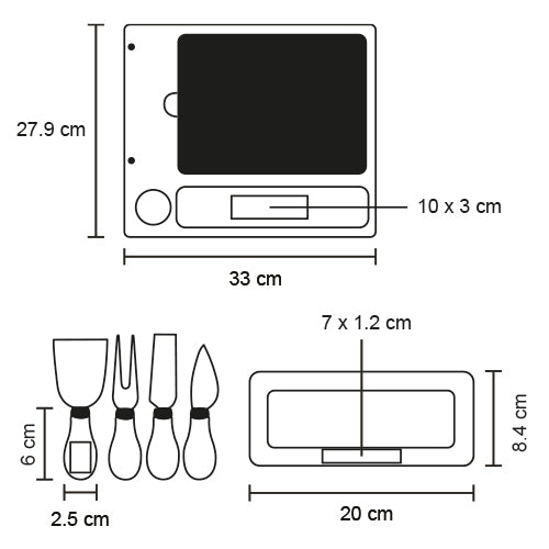 tabla para quesos con piedra, incluye 1 mini cuchillo de pala, 1 mini tenedor para quesos, 1 cuchillo de avión estrecho, un cuchillo y un mini plato de cerámica.