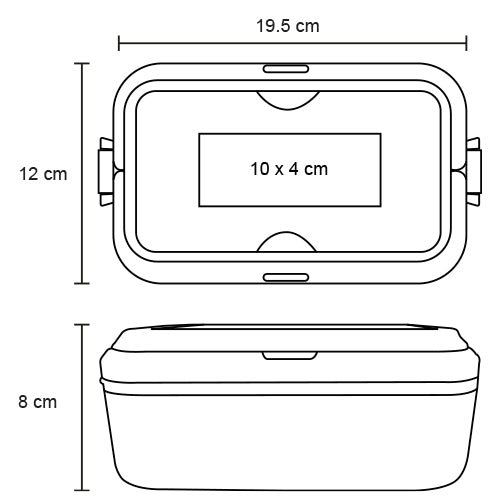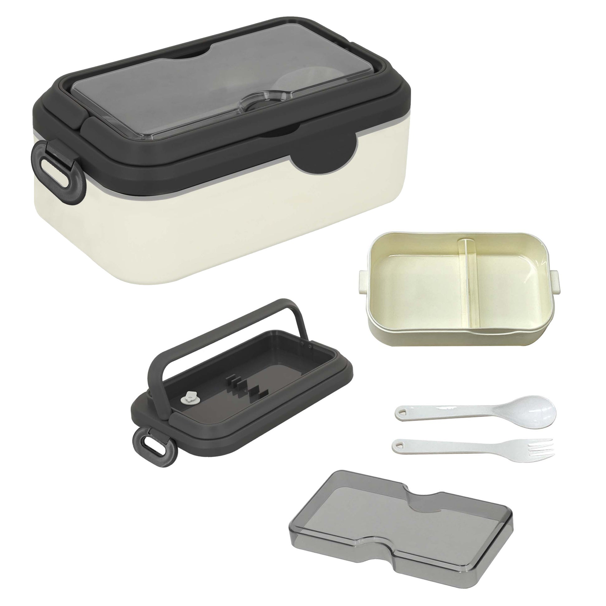 contenedor de alimentos de plástico, con asas superiores, clips de seguridad y compartimento para cuchara y tenedor.