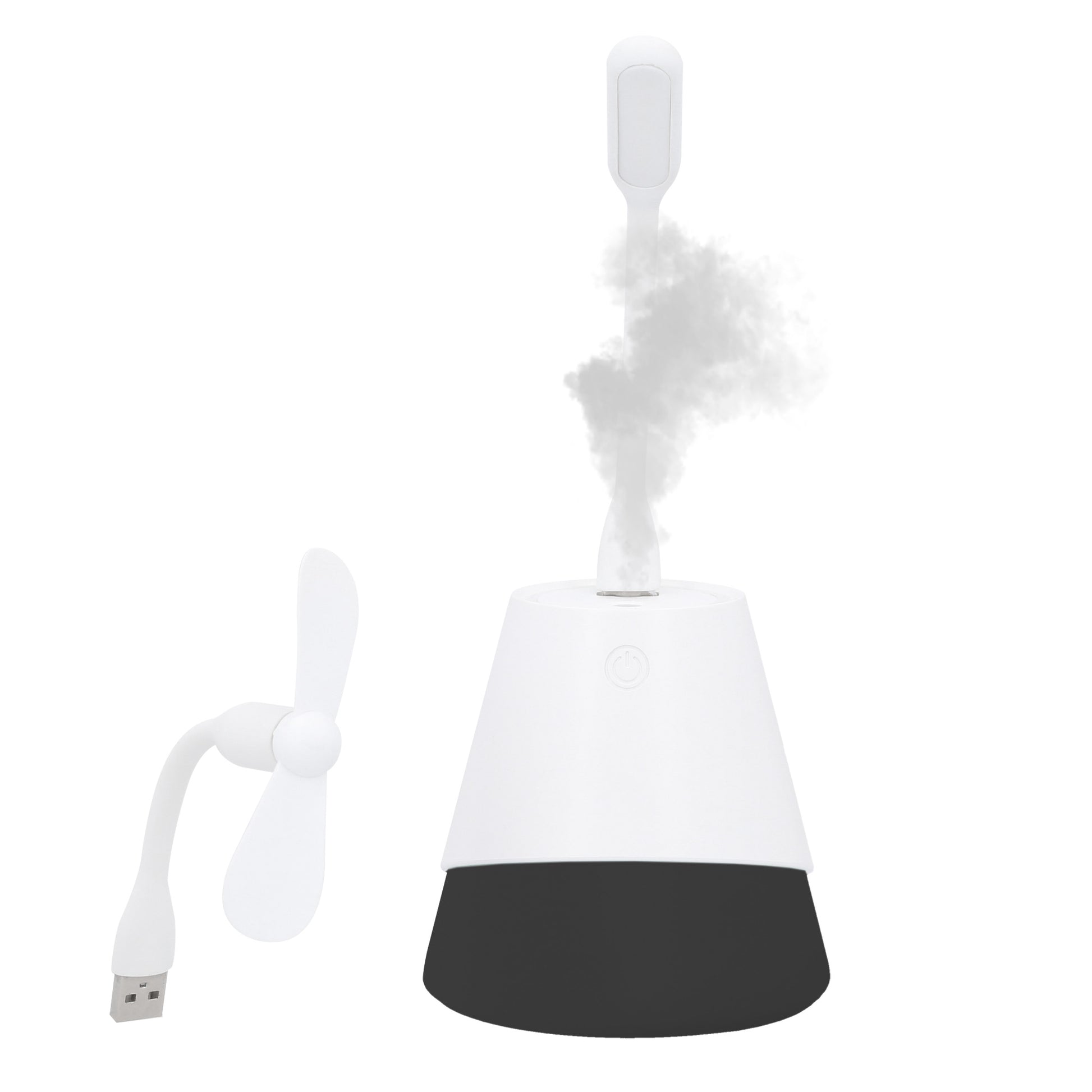 humidificador 3 en 1. incluye difusor, luz de noche, mini ventilador intercambiable y cable de carga.