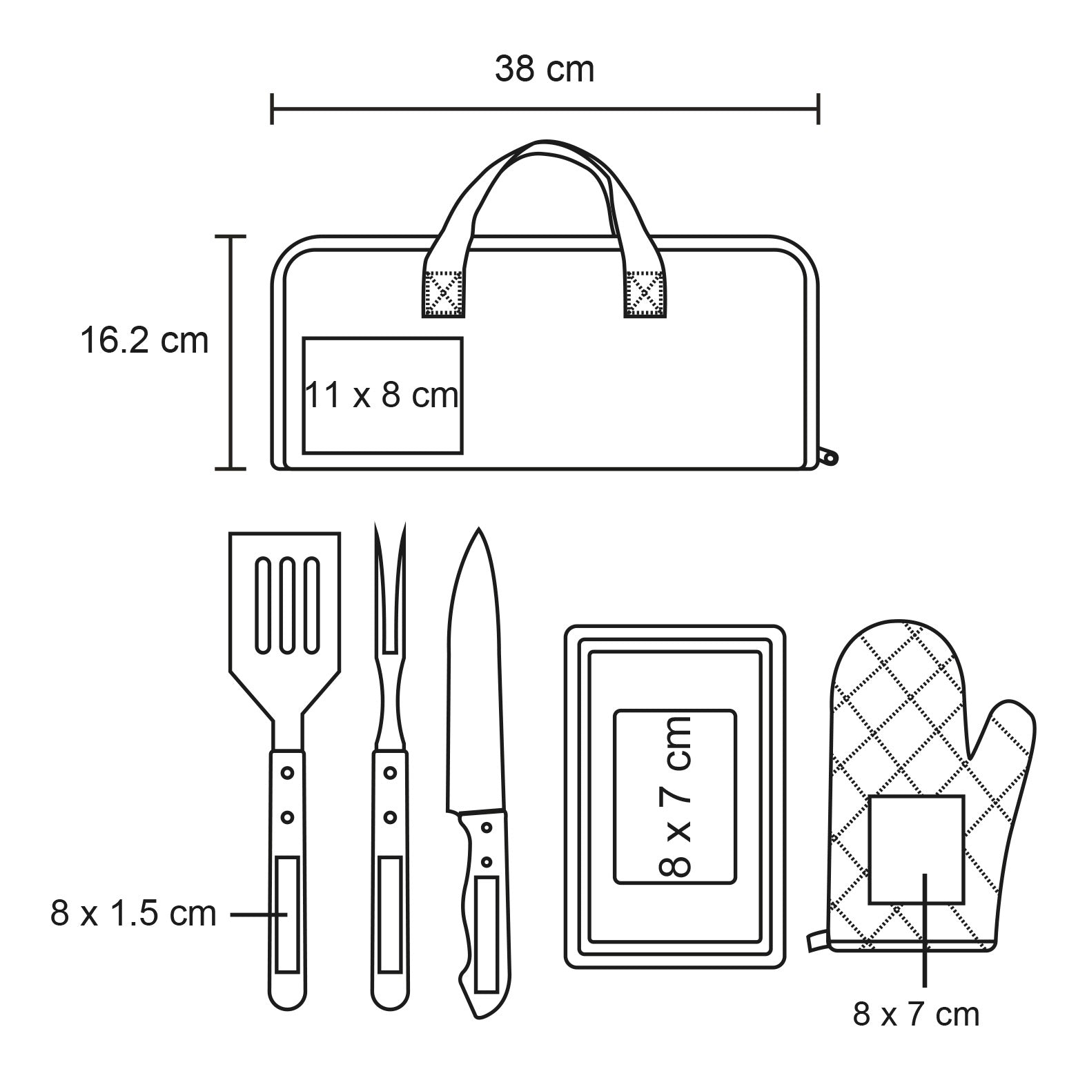 estuche portatil con utensilios para bbq. incluye tenedor, volteador, cuchillo, tabla y guante.