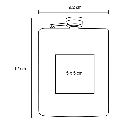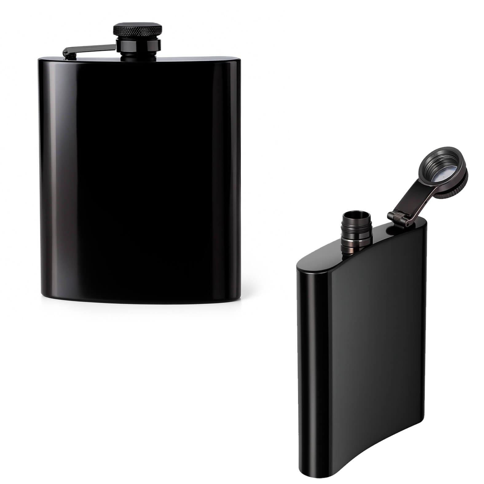 licorera de 7 oz. con acabado espejo y tapa enroscable sujeta al cuerpo.