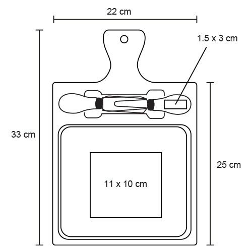tabla de quesos rectangular con mango, 1 tenedor y 1 cuchillo de pala.