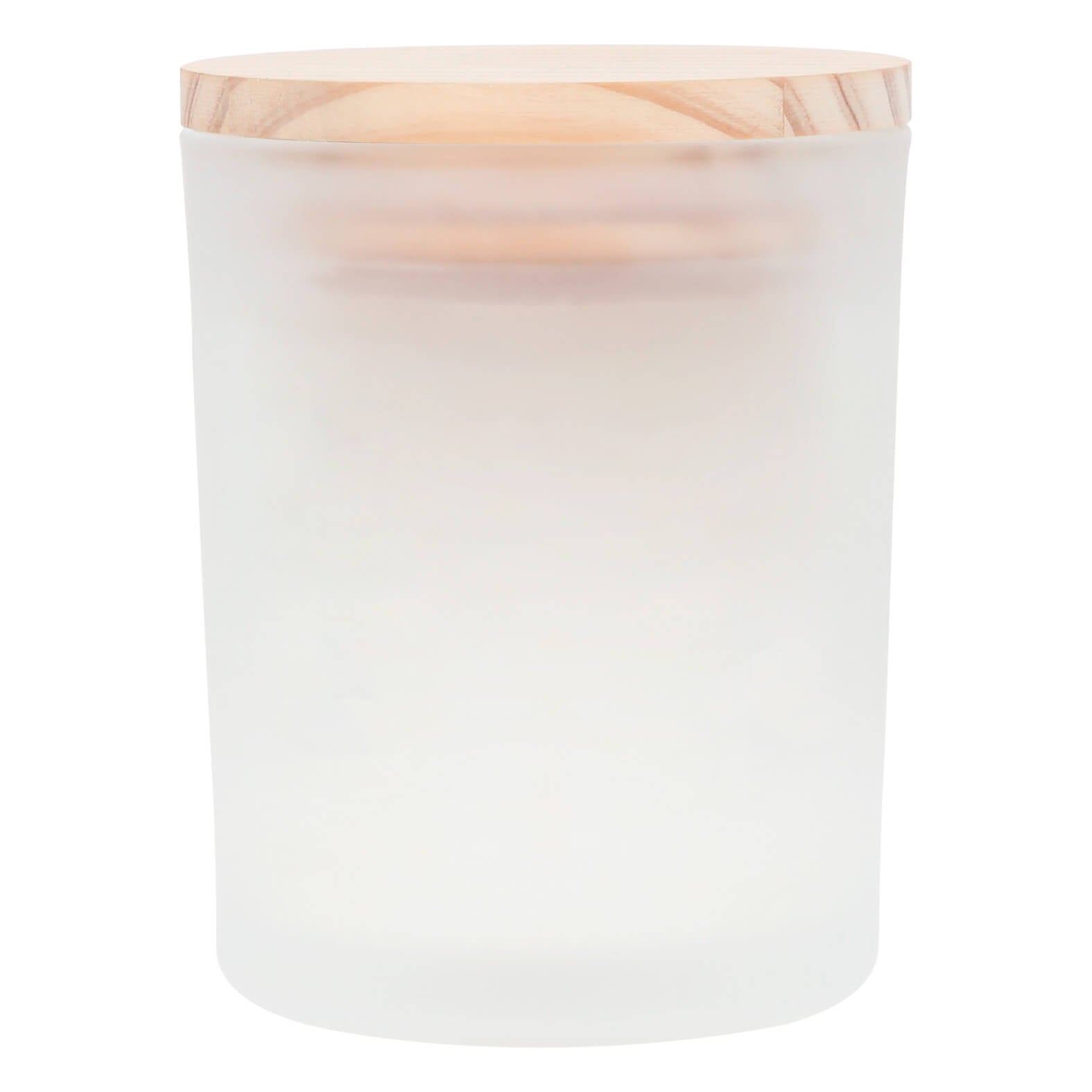 vela con olor a lavanda con envase de vidrio acabado frost y tapa de madera.