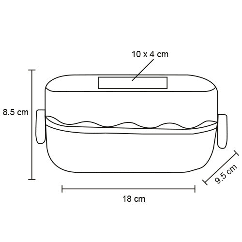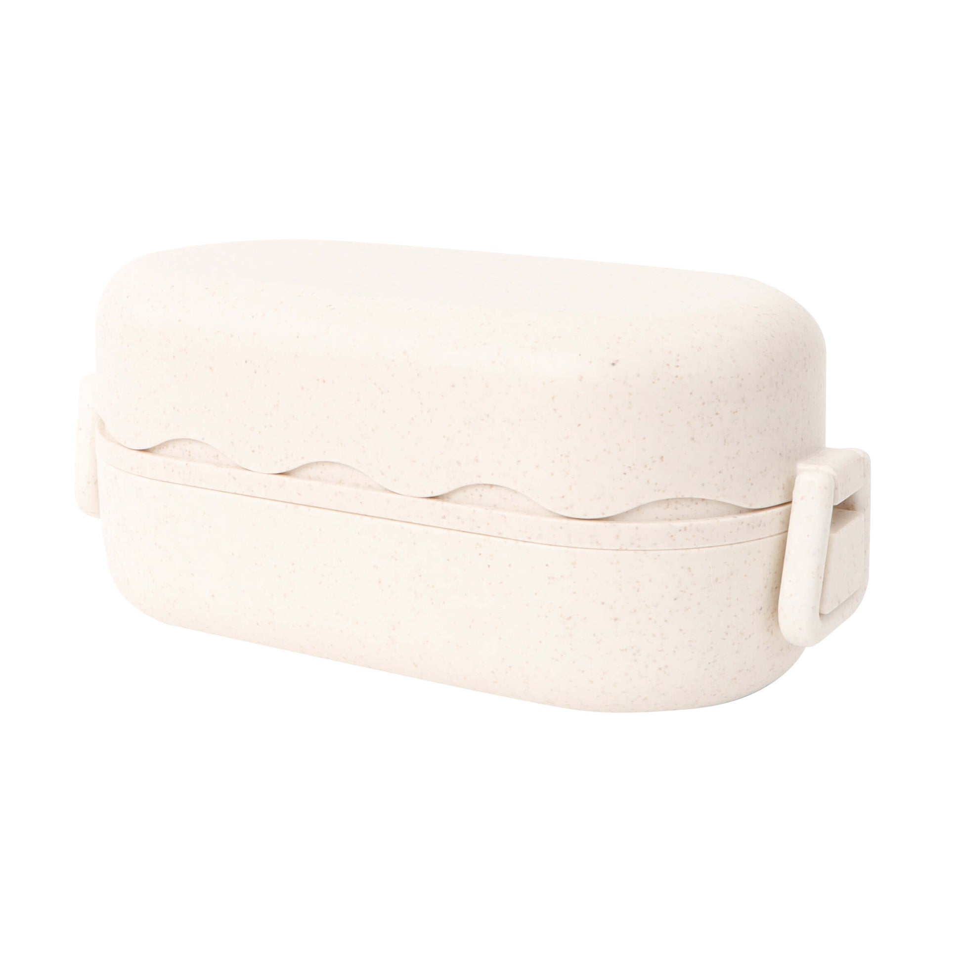 contenedor de alimentos con dos compartimentos principales, separador de comida, cuchara y broches laterales.