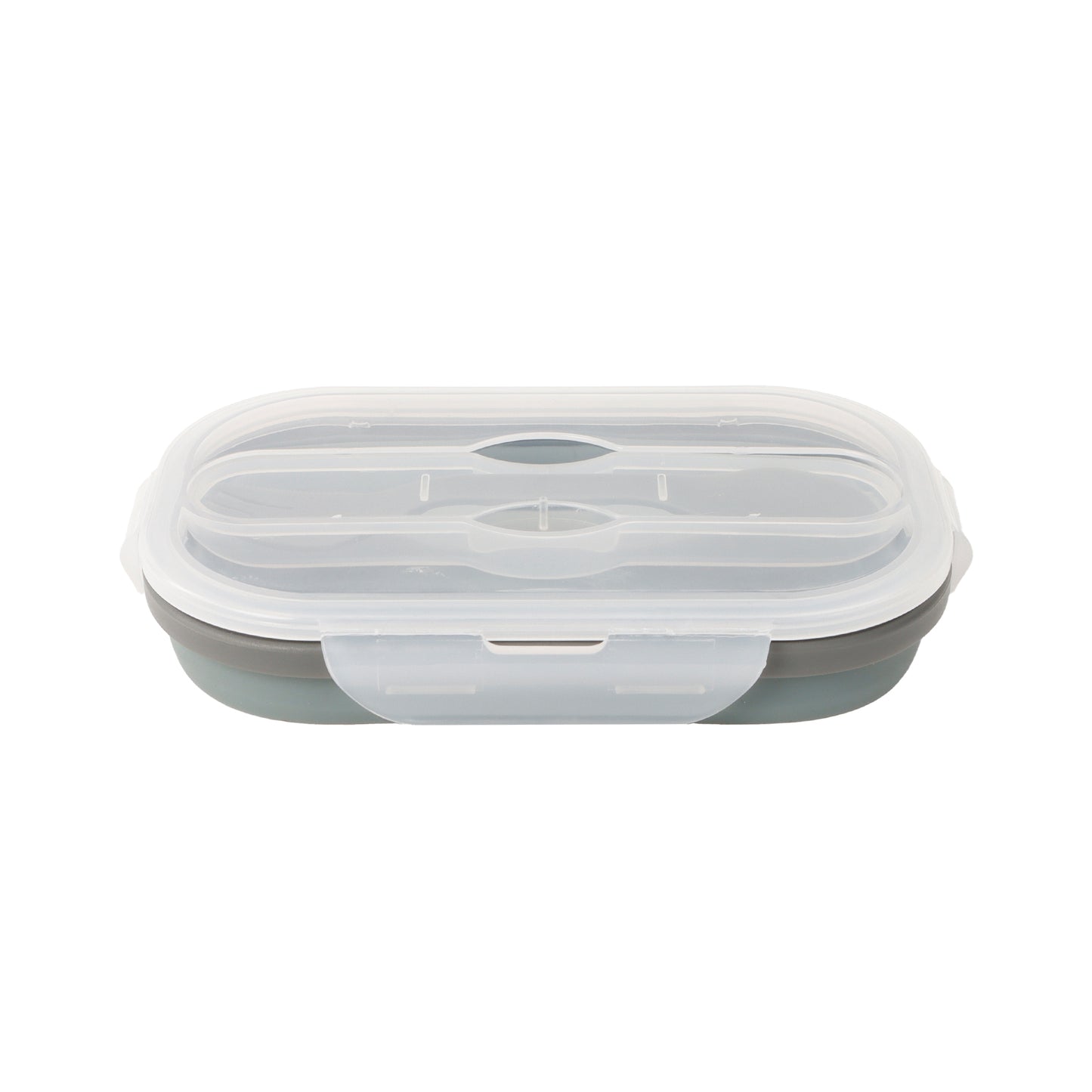 contenedor de alimentos de silicón plegable con cierre hermético y utensilios.