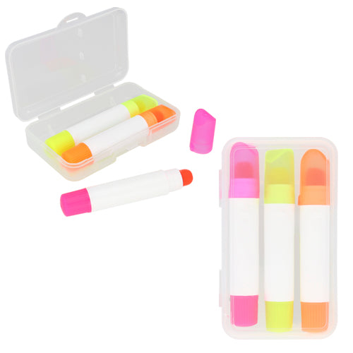 mini set con estuche plástico, broche y 3 marcatextos de cera con mecanismo retráctil. (no se seca).