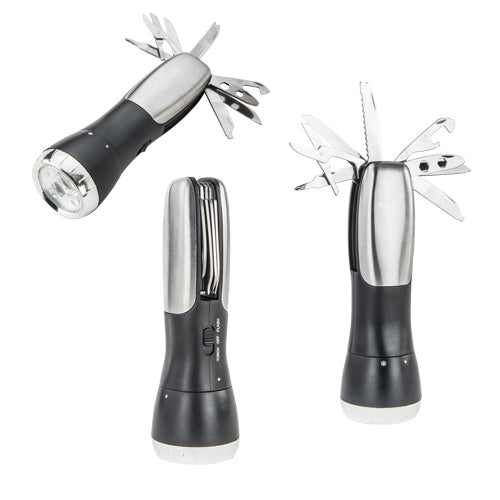 lámpara de cinco leds con flash y navaja de 8 funciones: destapador, navaja 2 sierras, desarmador, tijeras y lima, utiliza tres baterías aaa ya incluidas.