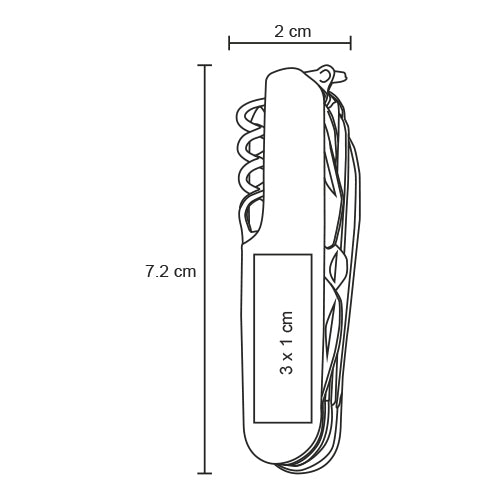 mini navaja metálica multiusos con 6 funciones que contiene: 2 destapadores, 1 con punta plana, navaja, sacacorchos, desarmador de cruz y arillo para usar como llavero.