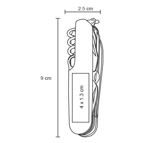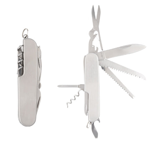 navaja metálica multiusos con 11 funciones que contiene: navaja, sacacorchos, 2 destapadores, 1 con punta plana, escariador, tijeras, sierra, descamador con quita anzuelos, desarmador de cruz, lima con limpia uñas, enhebrador de agujas y arillo para usar como llavero.
