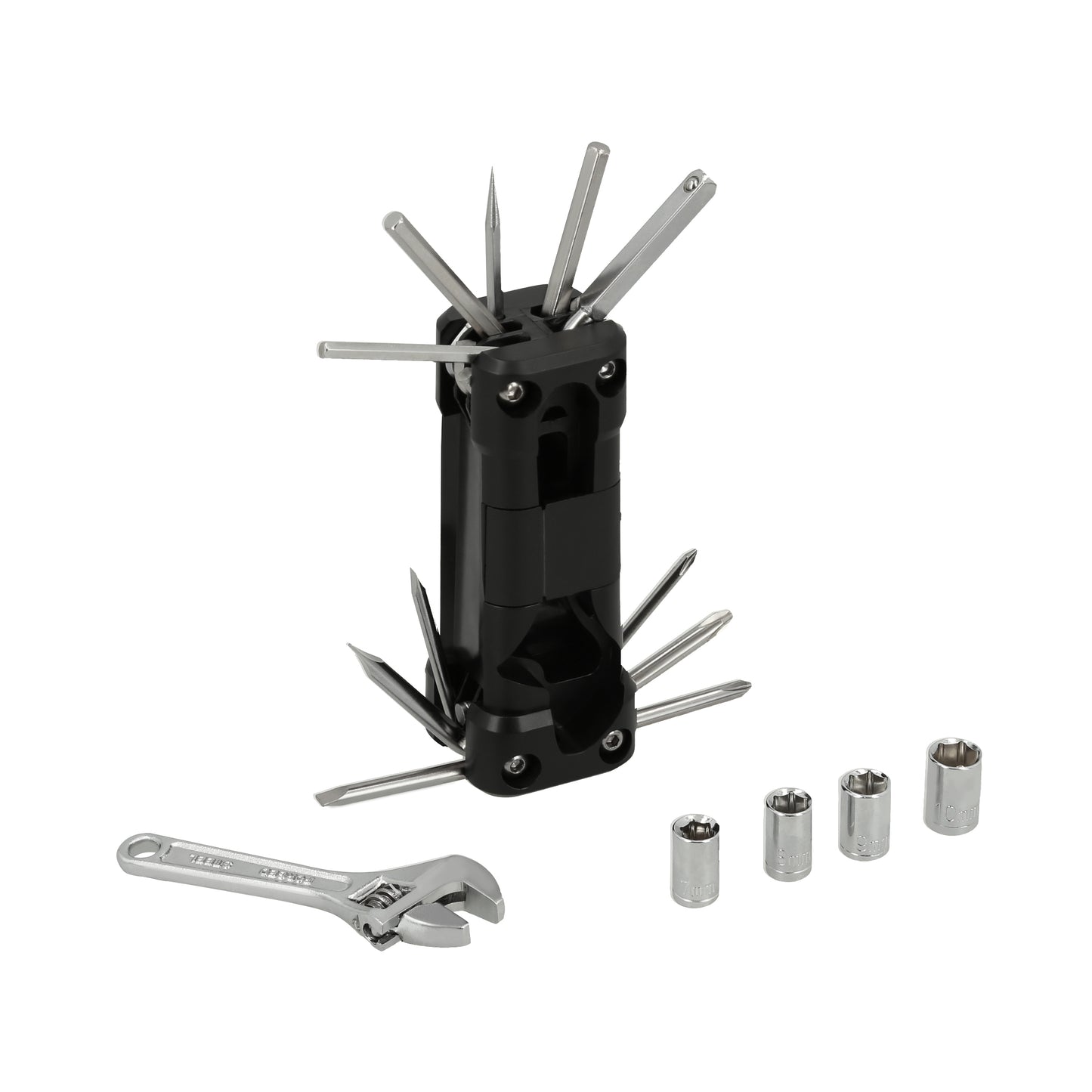 multi herramienta con llave inglesa, 5 llaves hexagonales, 4 dados, 3 puntas de cruz y 3 puntas planas.