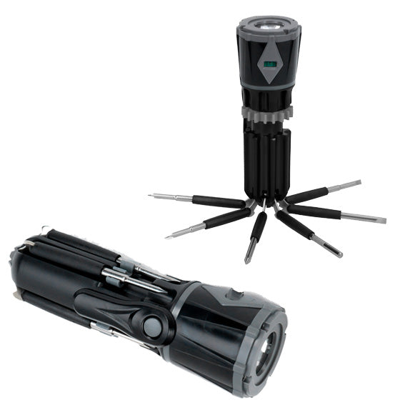 multi-herramienta con lámpara 12 en 1, incluye desarmadores, cuerpo de plástico con clip y flexómetro. utiliza 3 baterías aaa (no incluidas).