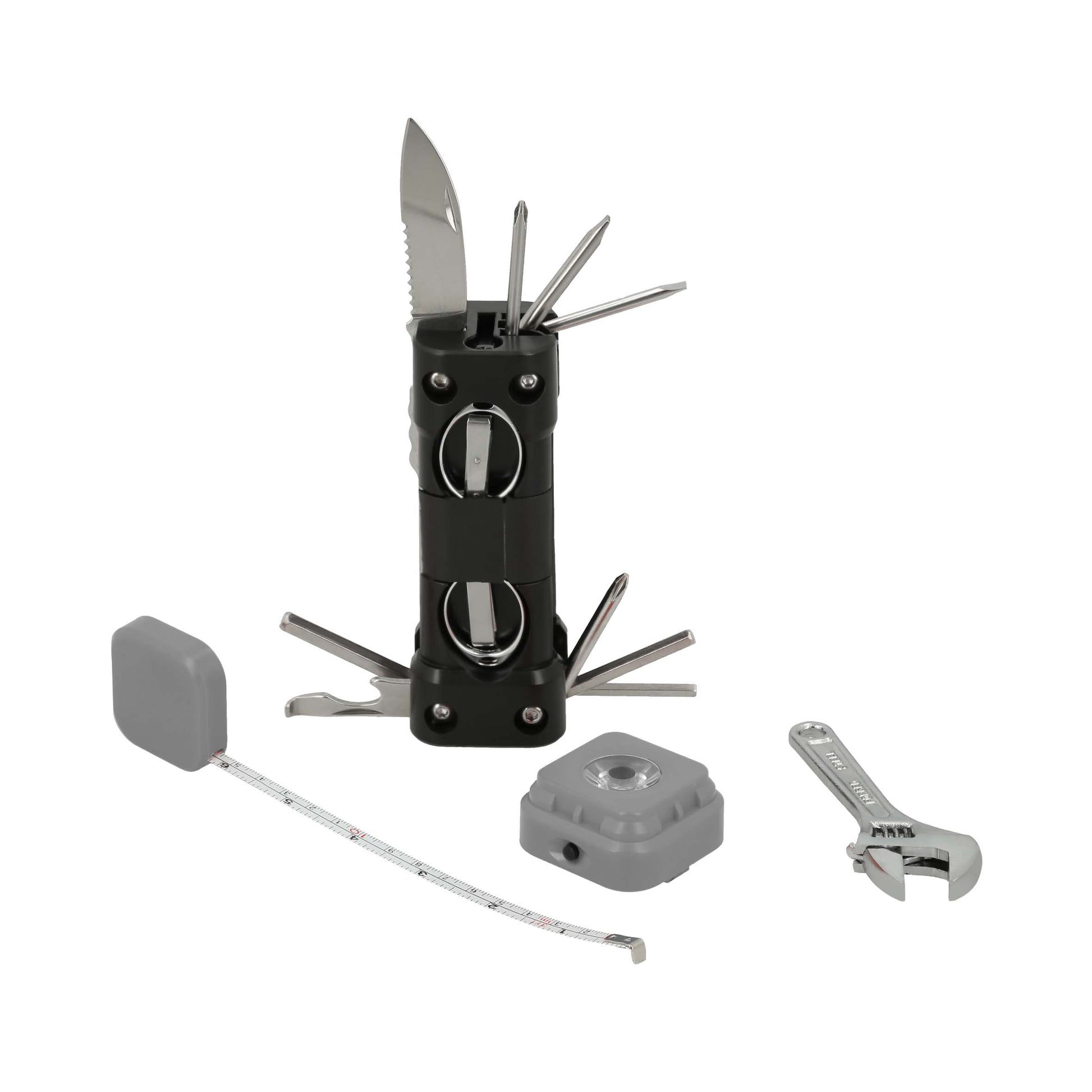 multi herramienta 13 en 1, cuerpo de plástico con lámpara y flexómetro. utiliza 3 baterías lr44 (no incluidas)