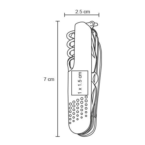 navaja metálica multiusos con 11 funciones que incluyen: desarmador, tijeras, destapador, navaja, sierras y sacacorchos, cuenta con arillo para usar como llavero y caja de regalo.
