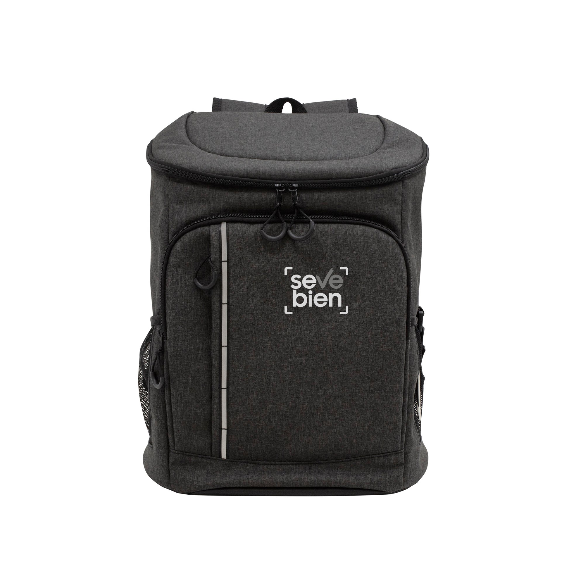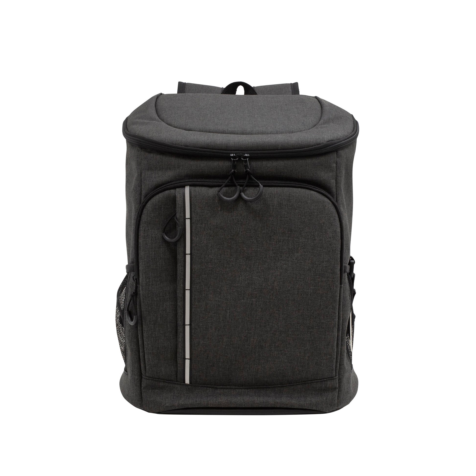29 x 43 x 18 cm. capacidad 18 litros aprox. poliéster wulong 300d + interior forrado en peva color plata con relleno de espuma de pe. mochila cooler. compartimento principal con cierre en la parte superior. compartimento frontal con cierre, bolsillo interno de red con cierre y bolsillo externo vertical con cierre y banda reflectante. dos bolsillos laterales de red multipropósito. incluye destapador de botellas de acero inoxidable (6,3 x 3,3 cm) extraíble. correas regulables acolchadas. cierres metálicos. tiradores de cierre plásticos en forma de u de color negro.