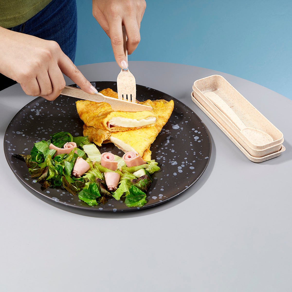 set de cubiertos portátil material eco-friendly. contiene cuchara, tenedor, cuchillo y estuche de almacenamiento. liviano y fácil de transportar. adecuado para lonchera escolar, almuerzo de trabajo, viajes etc.