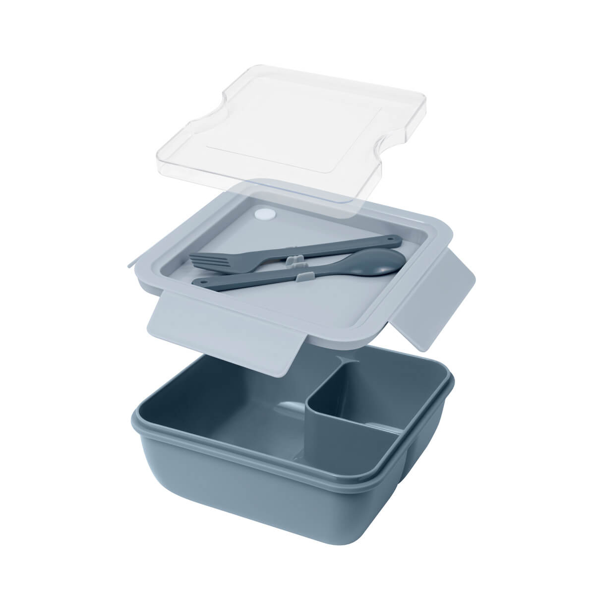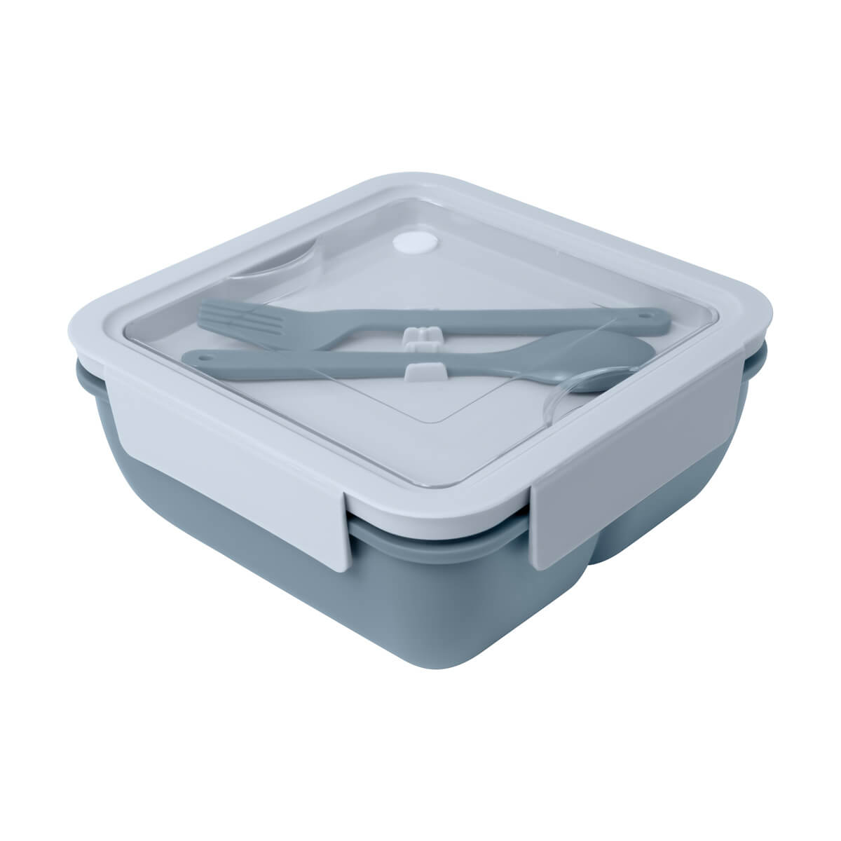 contenedor de alimentos compacto y versátil con divisor interno para mantener tus alimentos seguros y organizados. tapa con cierre hermético de cuatro pestañas para evitar derrames. sobre tapa con compartimento integrado que incluye un tenedor y una cuchara. su innovador diseño, ofrece una solución práctica para transportar tus alimentos a cualquier lugar. apto para microondas.