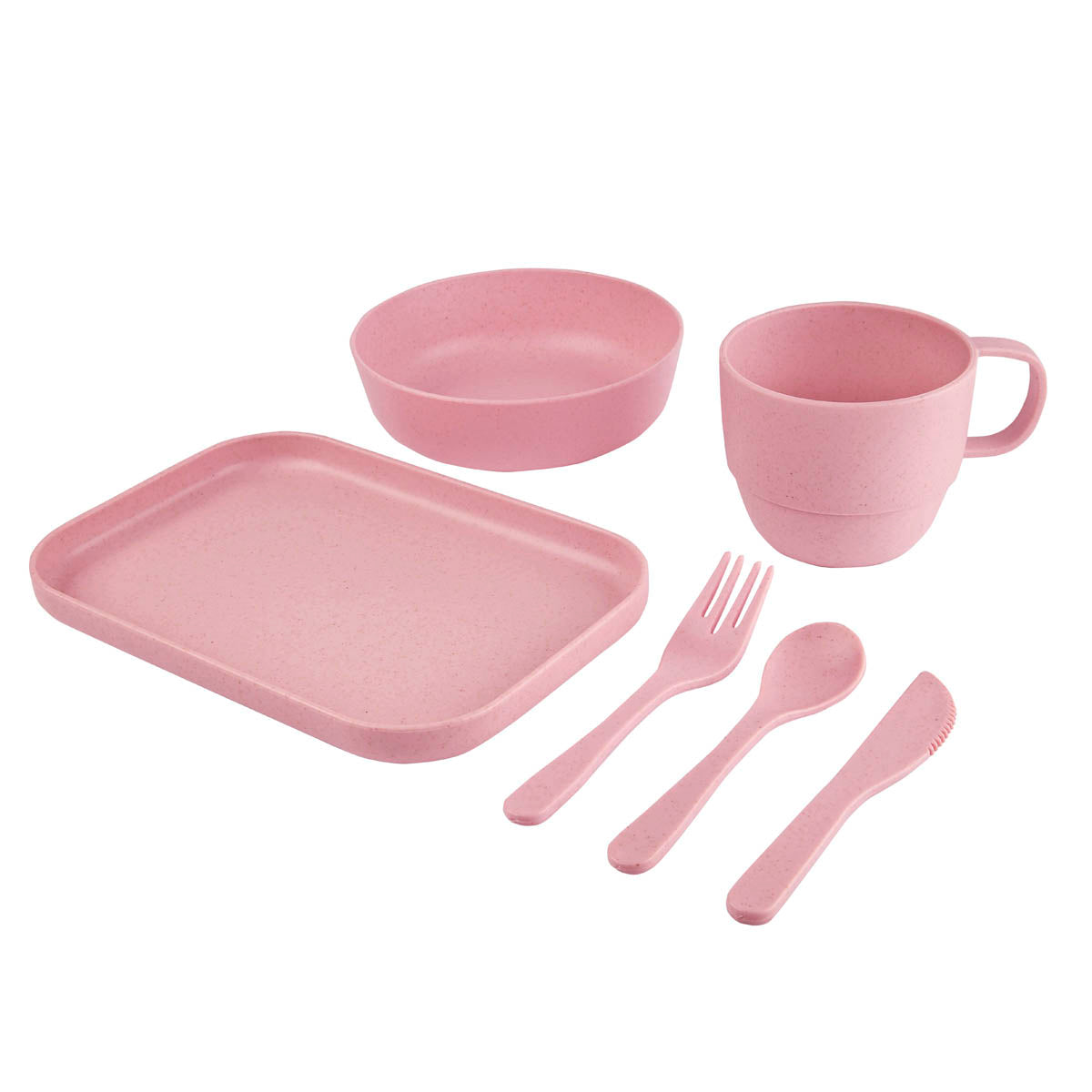 vajilla de 6 piezas con material eco-friendly. contiene plato extendido, plato hondo, taza, cuchara, tenedor y cuchillo. con un diseño atractivo y funcional, es ideal tanto para los más pequeños como para los adultos, garantizando una experiencia de comida segura y respetuosa con el medio ambiente. incluye caja individual. apto para lavavajillas y microondas.
