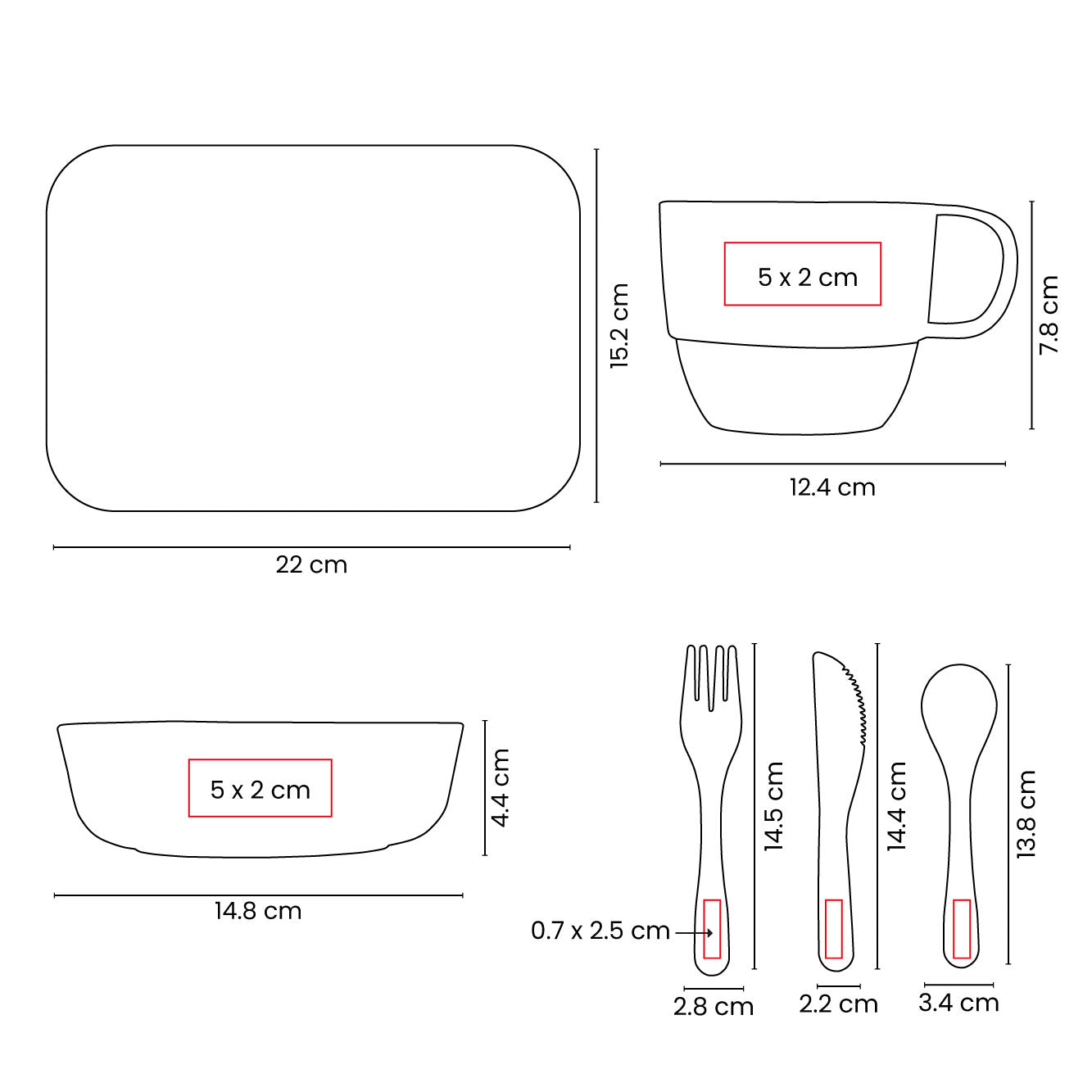 área de impresión: 5 x 2 cm plato hondo / 5 x 2 cm taza / 0.7 x 2.5 cm cubiertos