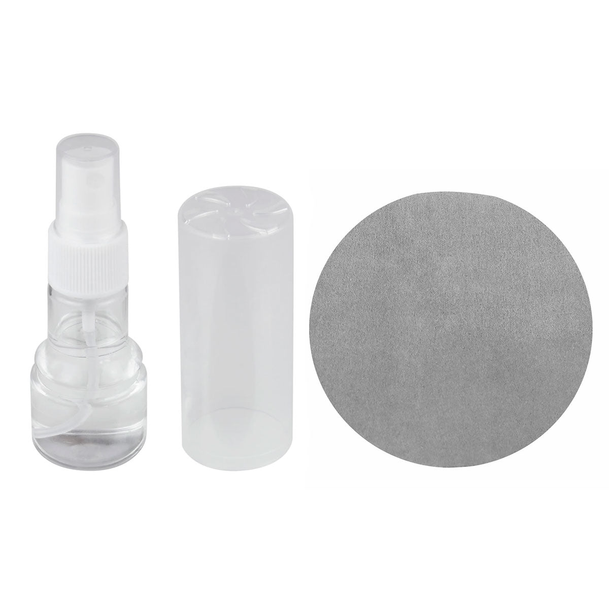 atomizador con líquido limpia pantallas y microfibra de 12.5 cm de diámetro. el atomizador y la fibra se entregan por separado para su impresión.