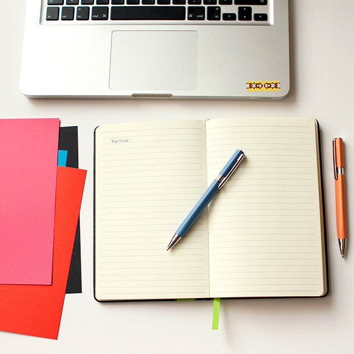 libreta pasta rígida fabricada en poliuretano con resorte, porta pluma y detalles en color, con 80 hojas de raya. no incluye pluma. tamaño a5.