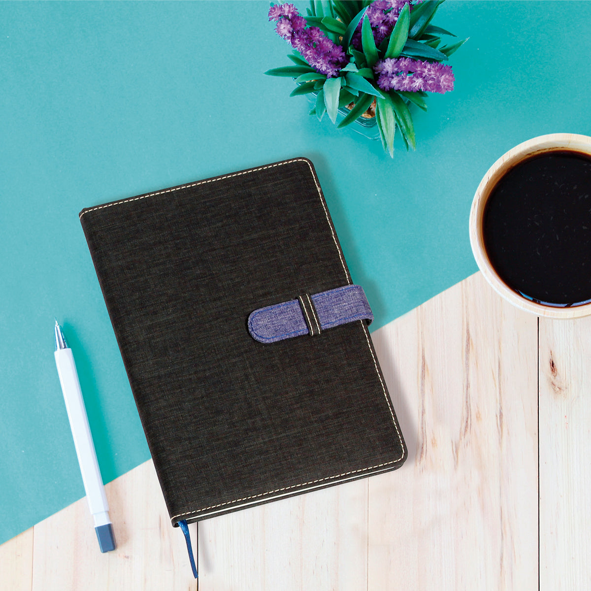 libreta fabricada en poliuretano con broche y listón separador de hojas en color, con 80 hojas de raya. tamaño a5.