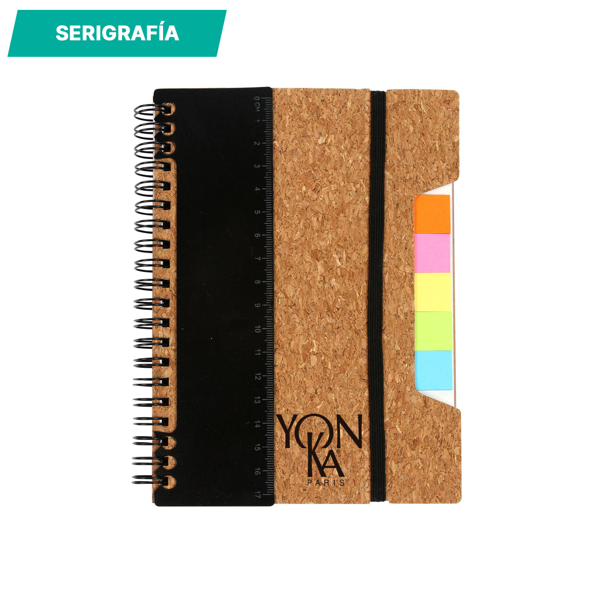 libreta con pasta tipo corcho, regla, resorte sujetador de pastas y banderas autoadheribles, con 80 hojas de raya.