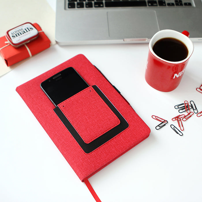libreta cubierta en curpiel pasta rígida con 80 hojas y separador, bolsillo porta celular. tamaño a5.