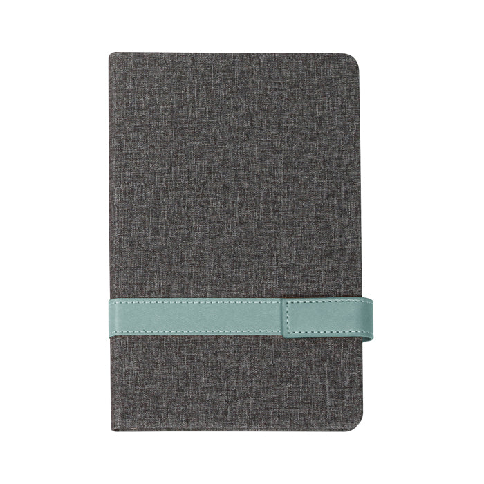 libreta fabricada en tela, con broche de color en curpiel . cuenta con separador de hojas el cual va a juego con el broche para cerrar , 80 hojas de raya. tamaño a5.