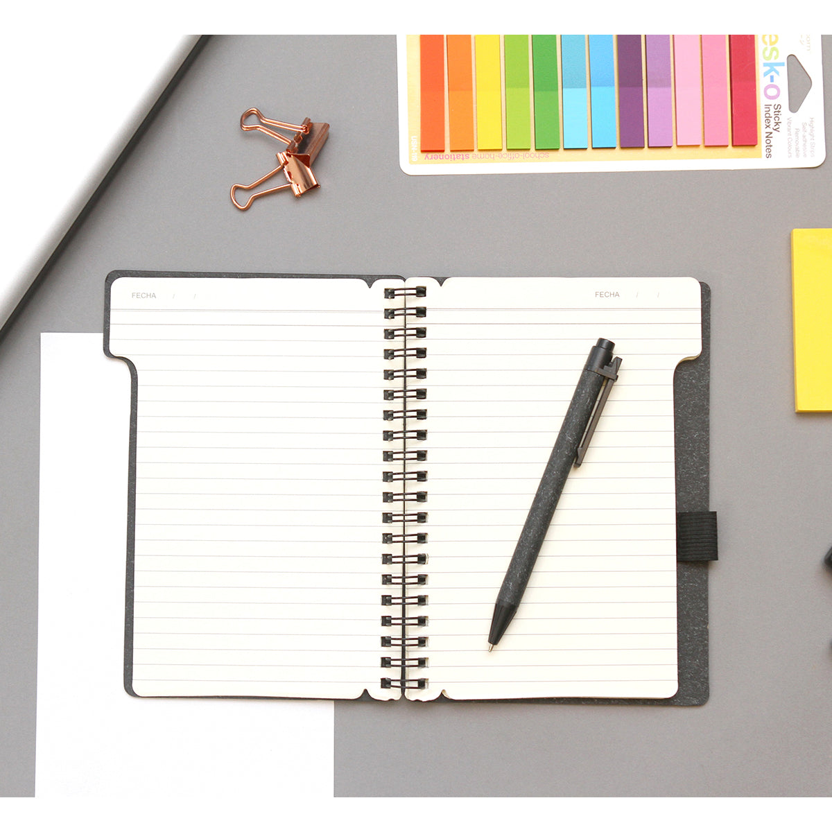 libreta ecológica con pasta de papel kraft; 70 hojas de papel de 80 gramos y bolígrafo con tinta de escritura negra fabricado en materiales ecológicos.