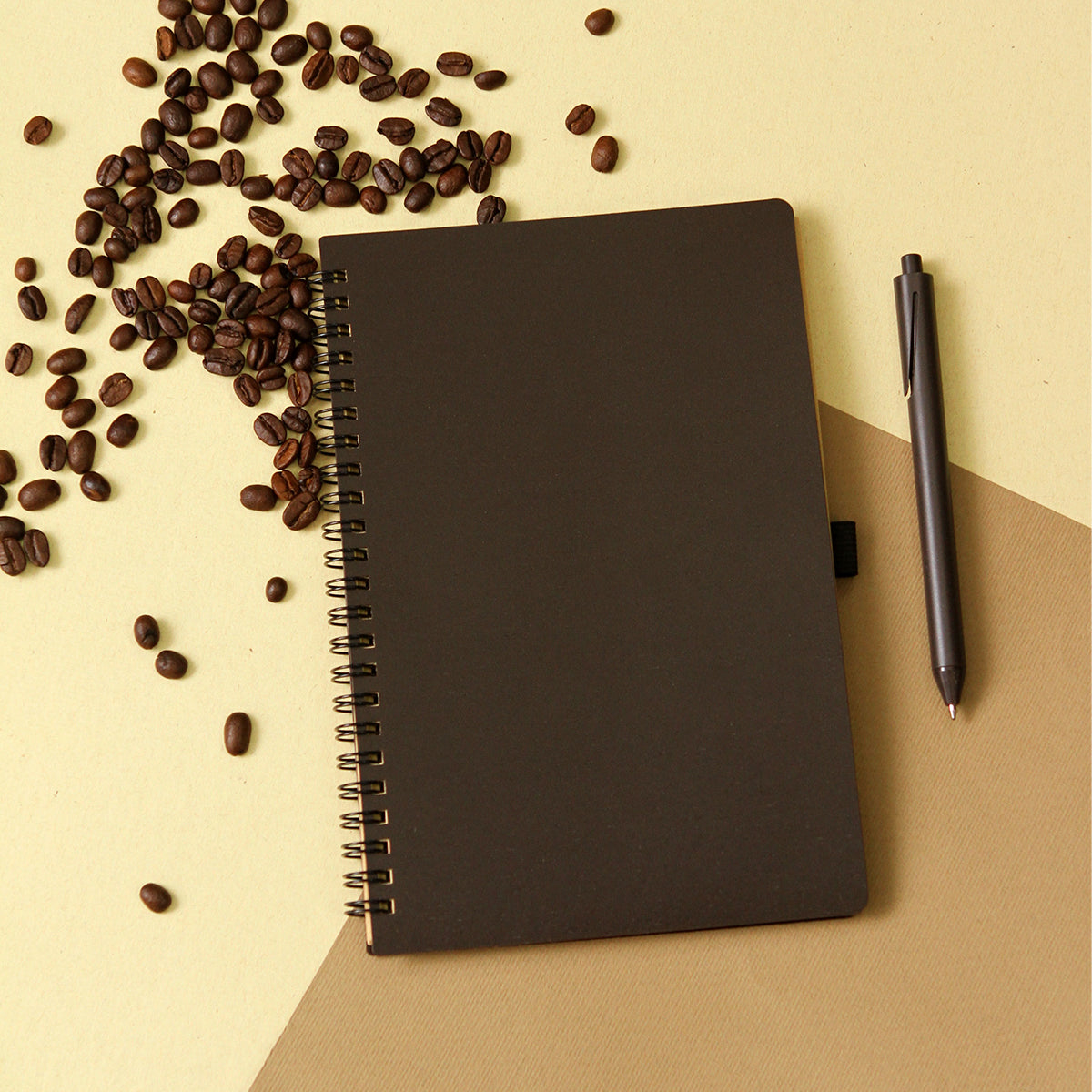libreta ecológica con pasta de fibra de granos de café y plástico abs, 70 hojas de papel de 80 gramos y bolígrafo fabricado en el mismo material ecológico con tinta de escritura negra. tamaño a5.