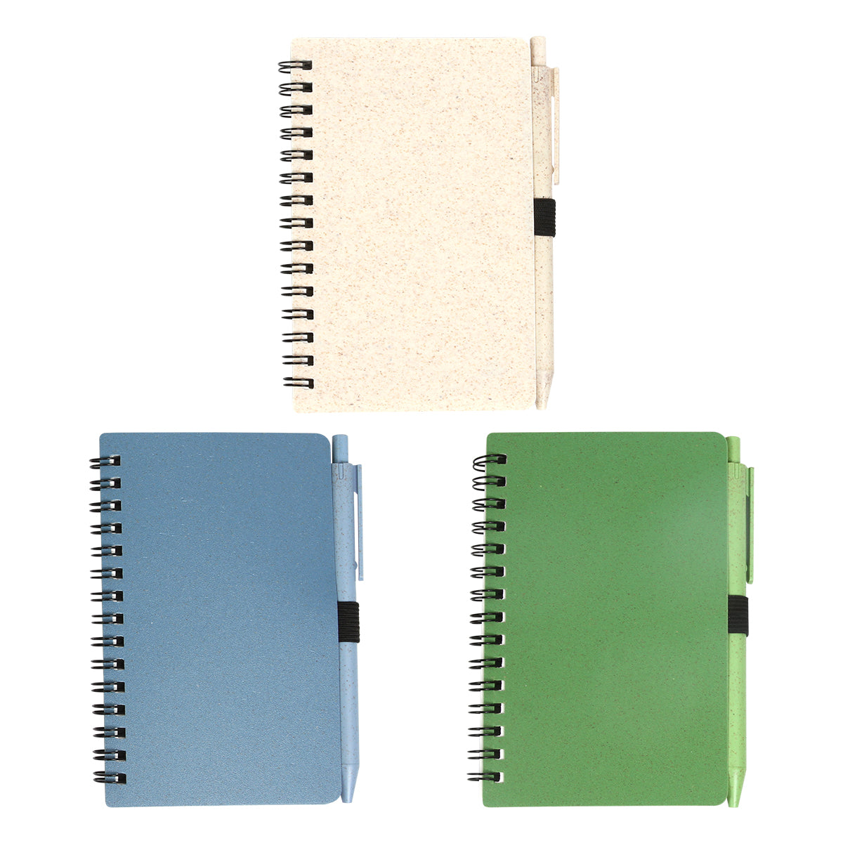 libreta ecológica con pasta de fibra de trigo y plástico abs, 60 hojas de papel de piedra y bolígrafo fabricado en el mismo material ecológico con tinta de escritura negra. tamaño a6.