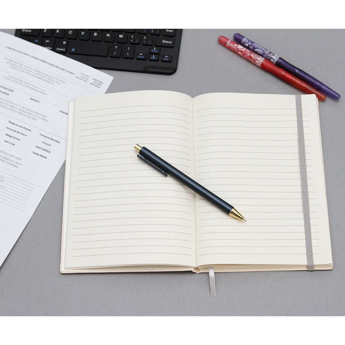 libreta fabricada en milk paper (cartones reciclados de leche) y cartón, con pasta rígida, banda elástica y separador de hojas. 80 hojas rayadas de 80 gr. tamaño a5. diseño eco-amigable, es una herramienta esencial para llevar contigo en el trabajo, la escuela o cualquier proyecto personal, mientras contribuyes al cuidado del planeta.
