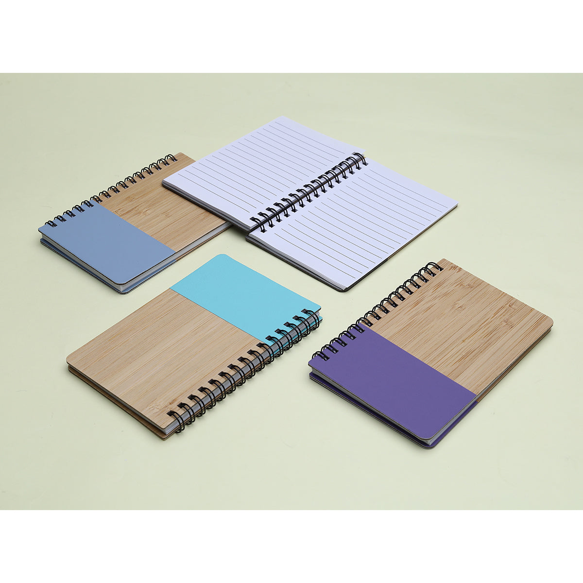 libreta con pasta de bambú y detalle de color en plástico pu, espiral metálica y 60 hojas rayadas de 70 g. tamaño a6.