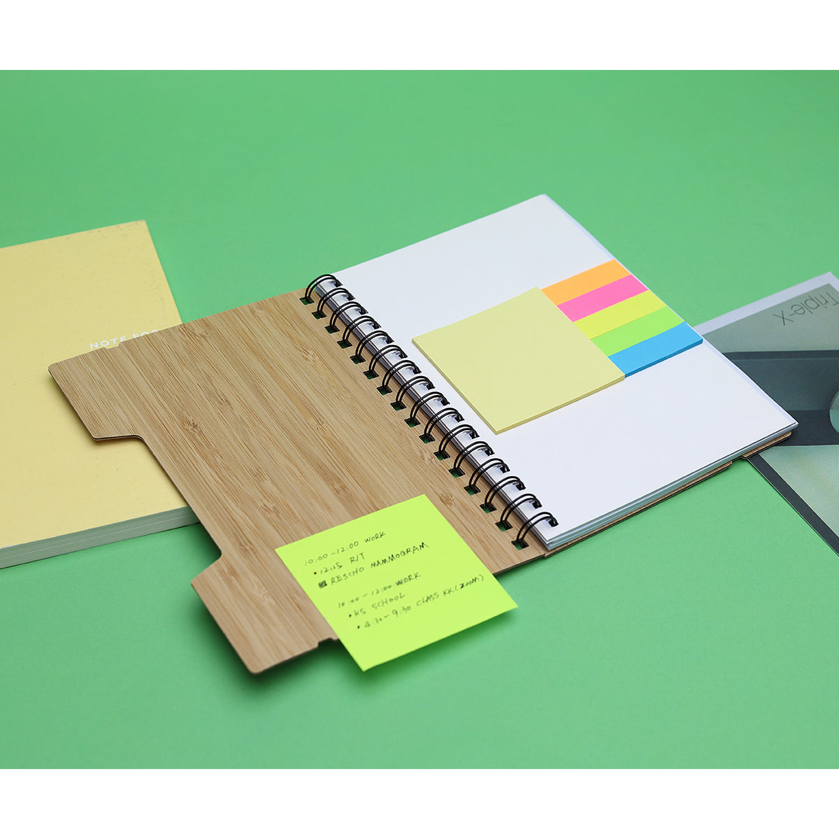 libreta con pasta de bambú, espiral metálico, 60 hojas rayadas de 70 g, notas adheribles, 25 banderines adheribles en 5 colores y banda elástica negra sujetadora de pastas. tamaño a5.