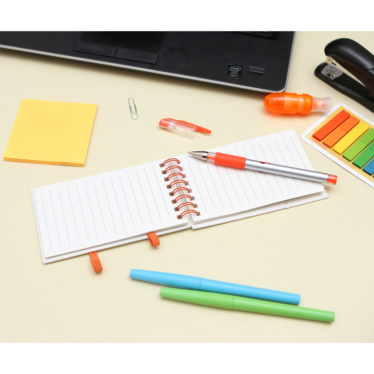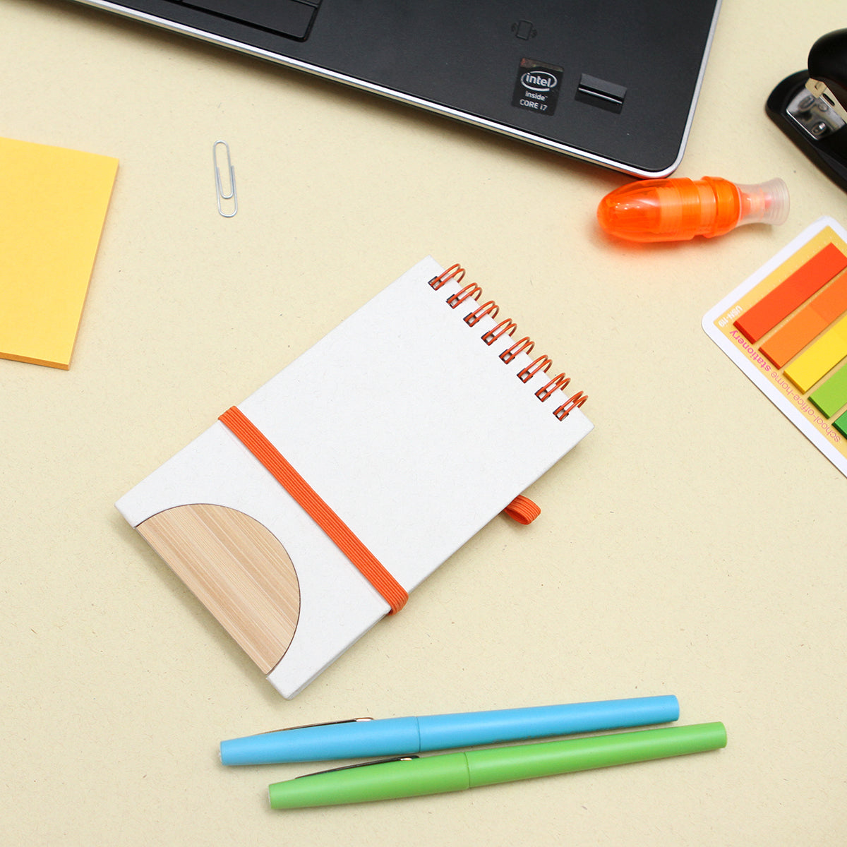 libreta fabricada con cartones de leche, con detalle de bambú en la parte inferior, espiral metálico y banda elástica, cuenta con 70 hojas rayadas de papel de 80 g. fabricadas con cartones de leche.