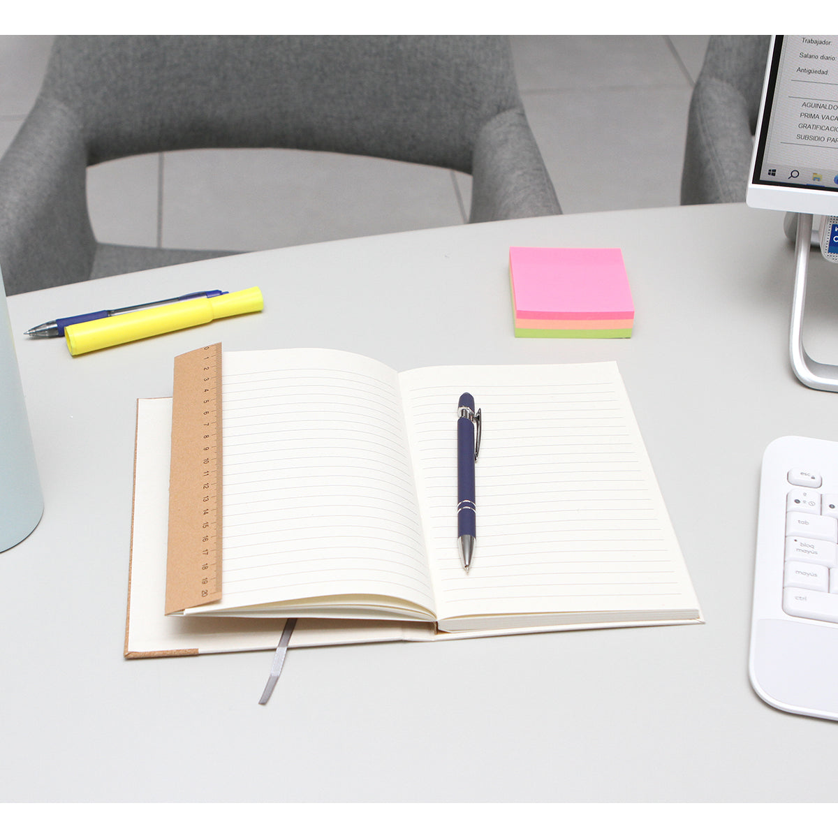 libreta fabricada en milk paper (cartones reciclados de leche) lo que la hace amigable con el medio ambiente y cartón con pasta rígida, separador de hojas, banda elástica detalle de corcho en la pasta y 80 hojas rayadas de 80gr. tamaño a5.