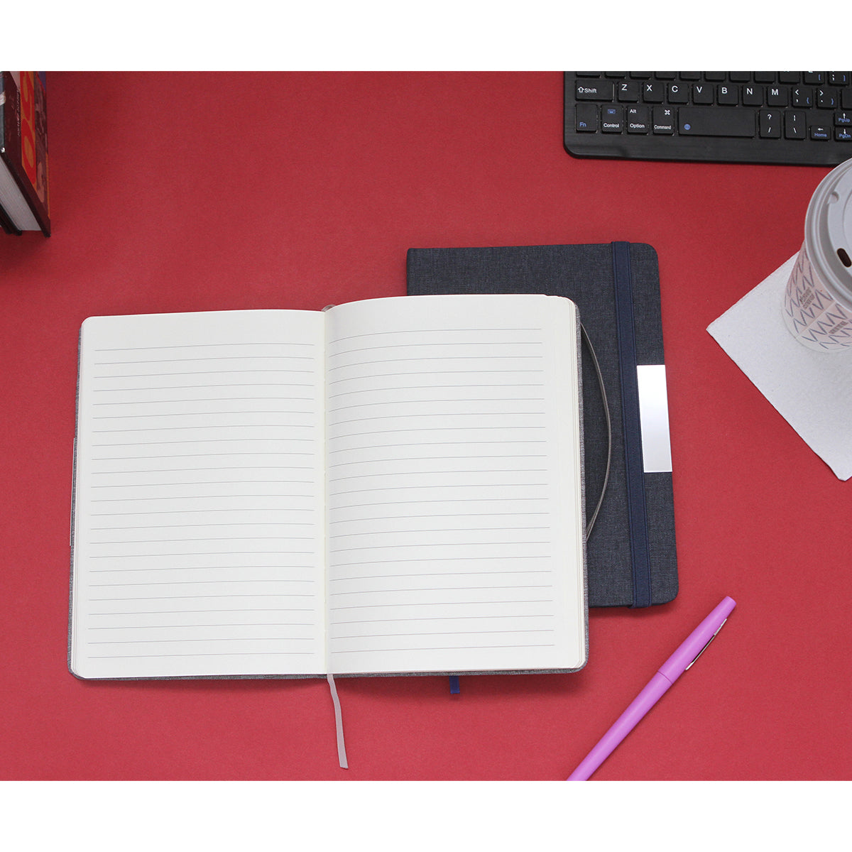 libreta con pasta rígida de poliéster reciclado, (rpet) con 80 hojas de 70g, banda elástica, separador de hojas, y placa metálica, hojas rayadas. una idea sostenible para tus notas o dibujos. los productos fabricados en rpet son sostenibles porque utilizan materiales reciclados en su fabricación, lo que reduce la cantidad de residuos y disminuye el impacto ambiental.