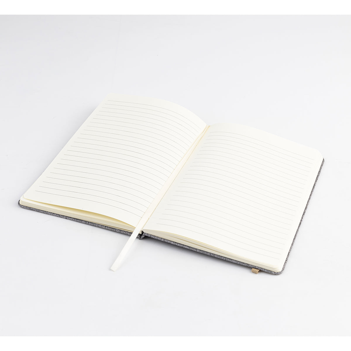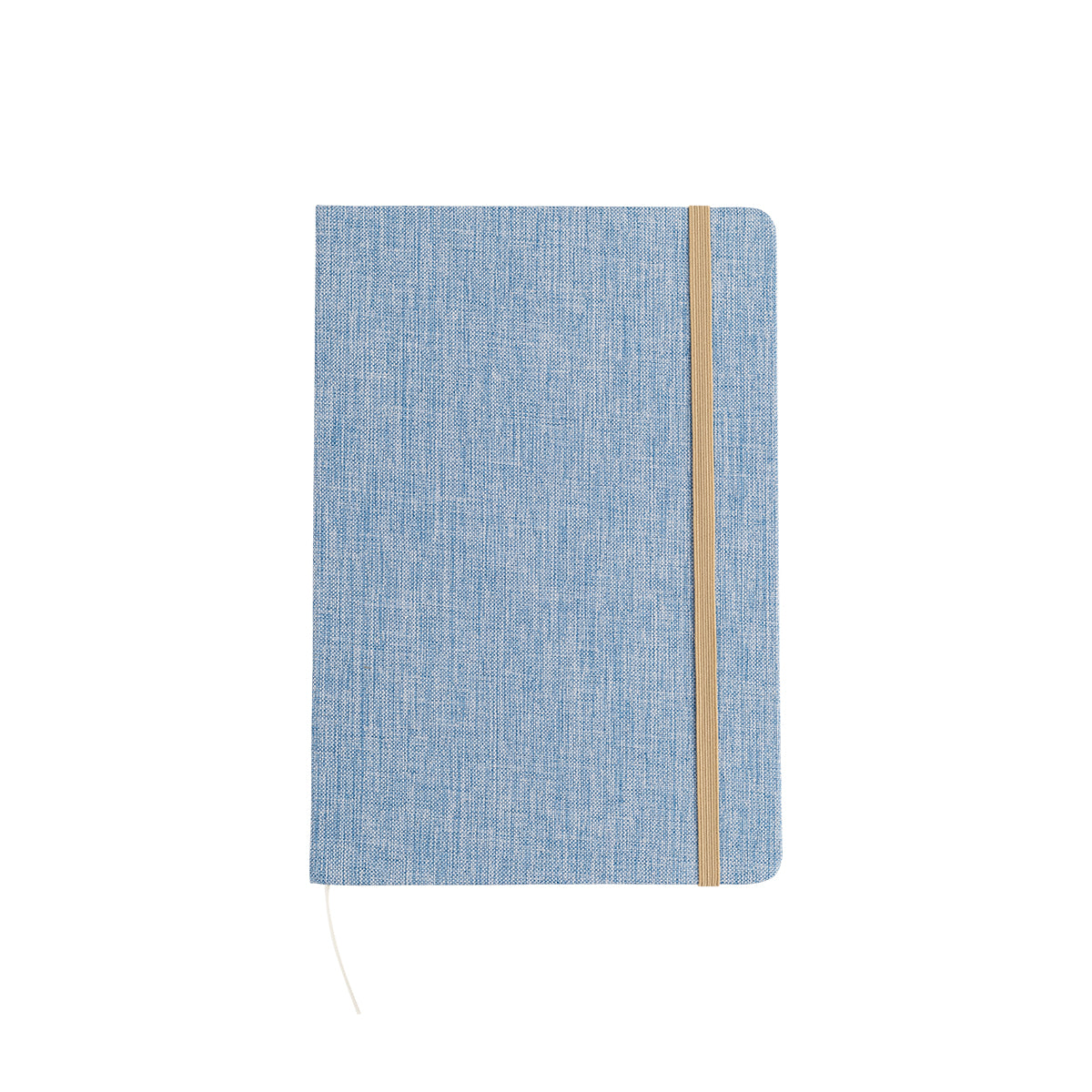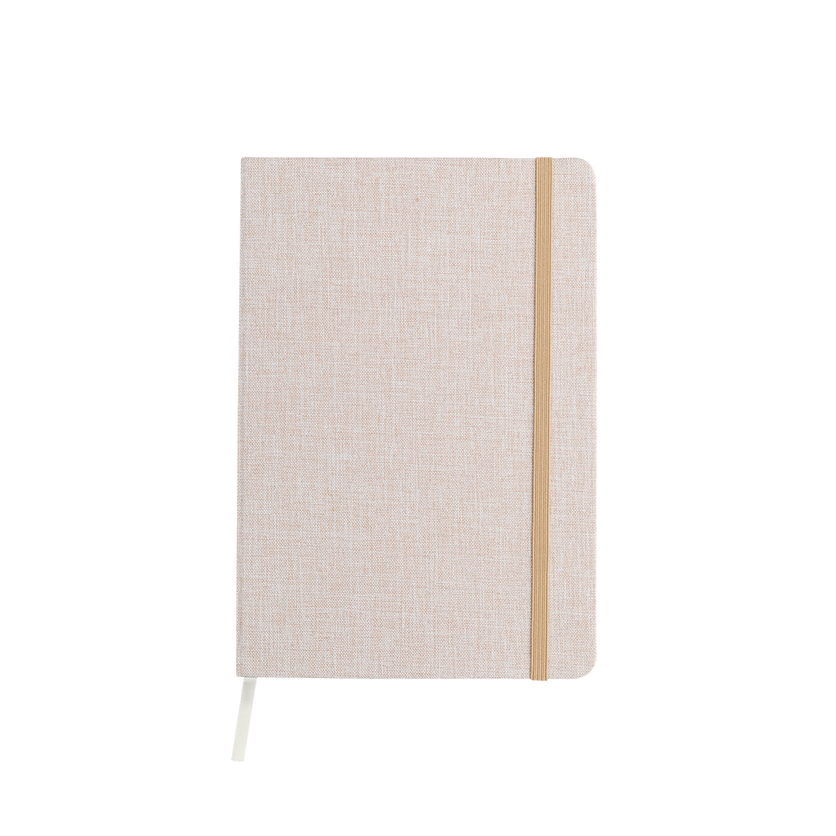 libreta con tapa de algodón reciclado con 80 hojas (rayadas) de 70 g de papel reciclado, con resorte sujetador de pastas y separador de hojas. esta libreta es una opción eco-amigable y práctica para tomar notas, escribir ideas o llevar un diario.