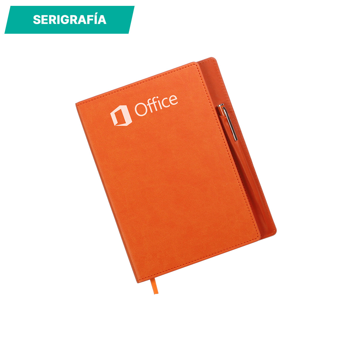 set de libreta con pluma, fabricada en curpiel brillante, con separador de hojas y compartimento porta bolígrafo, cuenta con 96 hojas, peso 70g. incluye bolígrafo roller de aluminio con barril en color a juego con la libreta.