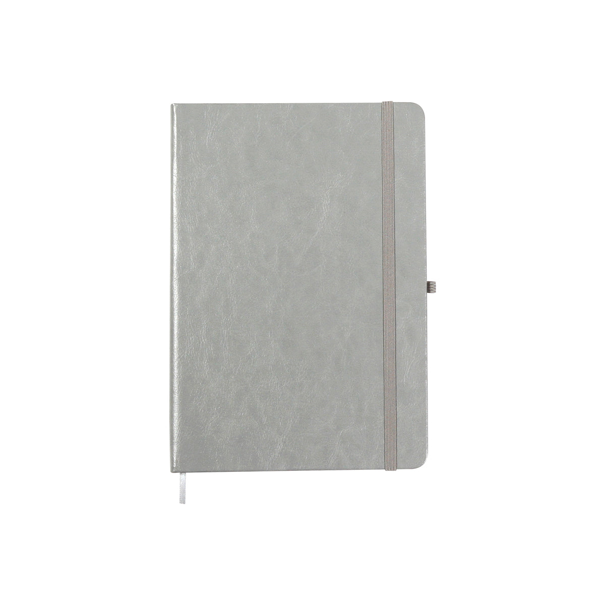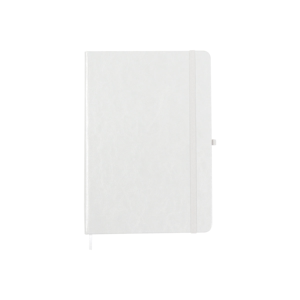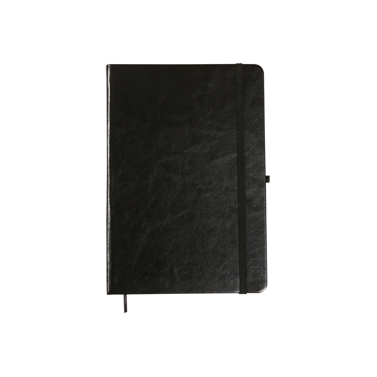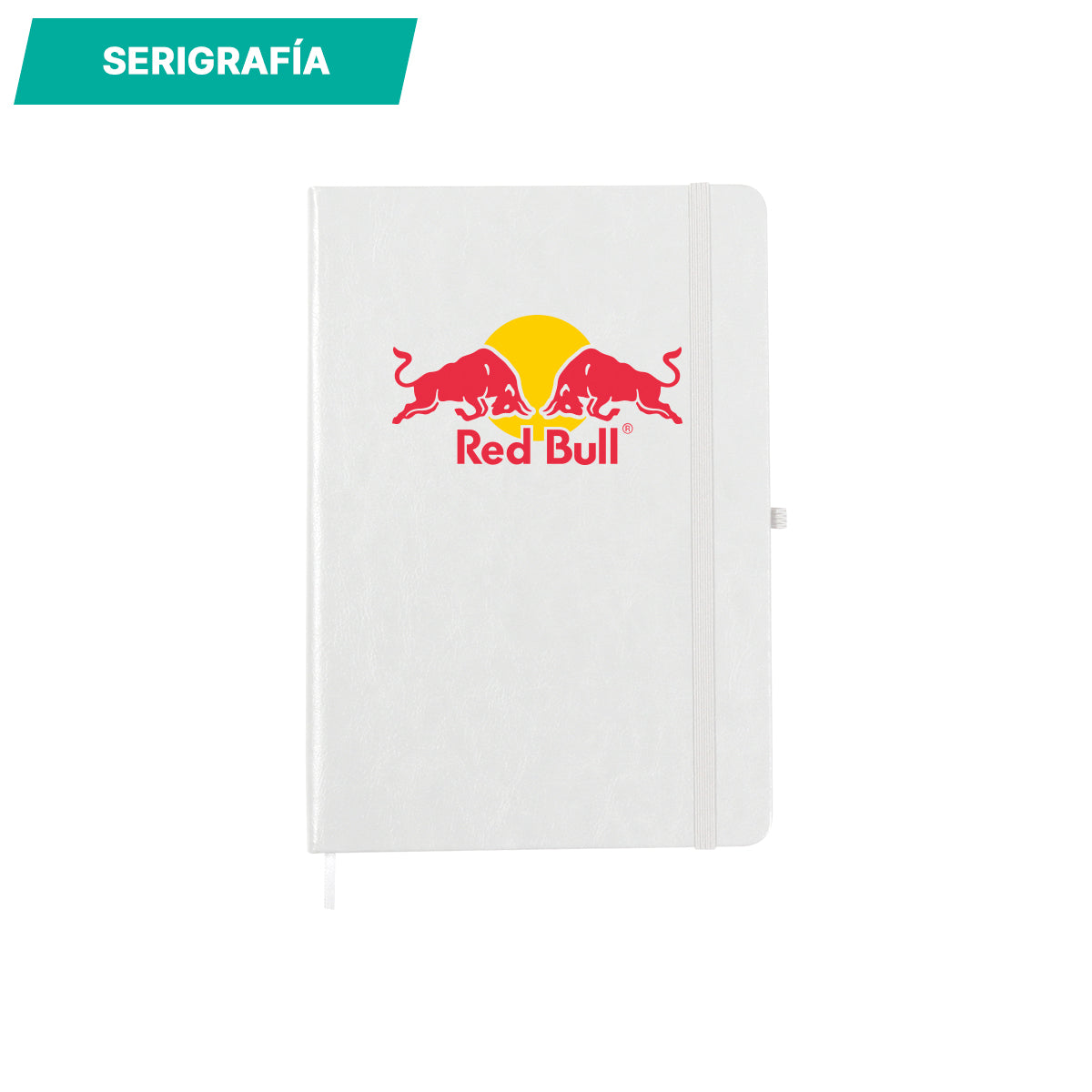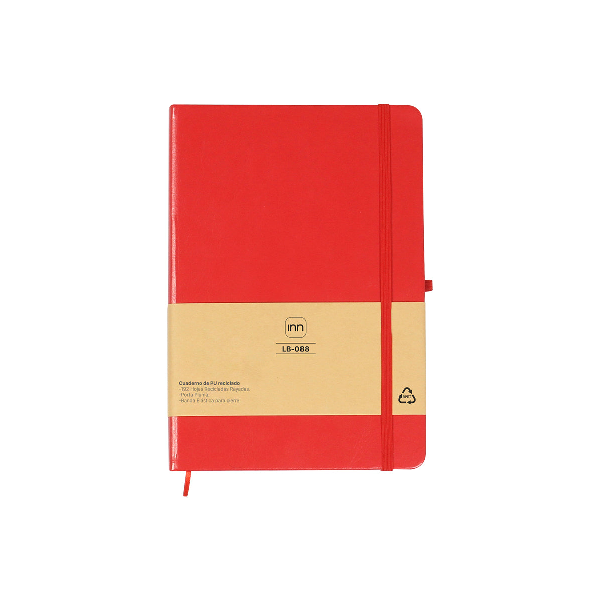 libreta fabricada en cuero sintético (pu) reciclado, resorte sujetador de pastas, separador de hojas, tamaño a5, 96 hojas y un peso de 70 gramos.