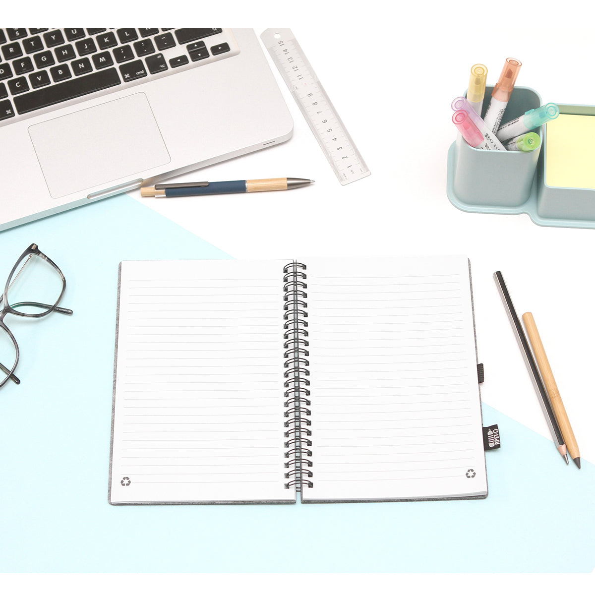 libreta con espiral fabricada en fieltro de rpet, con liga porta pluma, tamaño a5 con 80 hojas de 70 gramos cada una y páginas blancas rayadas.